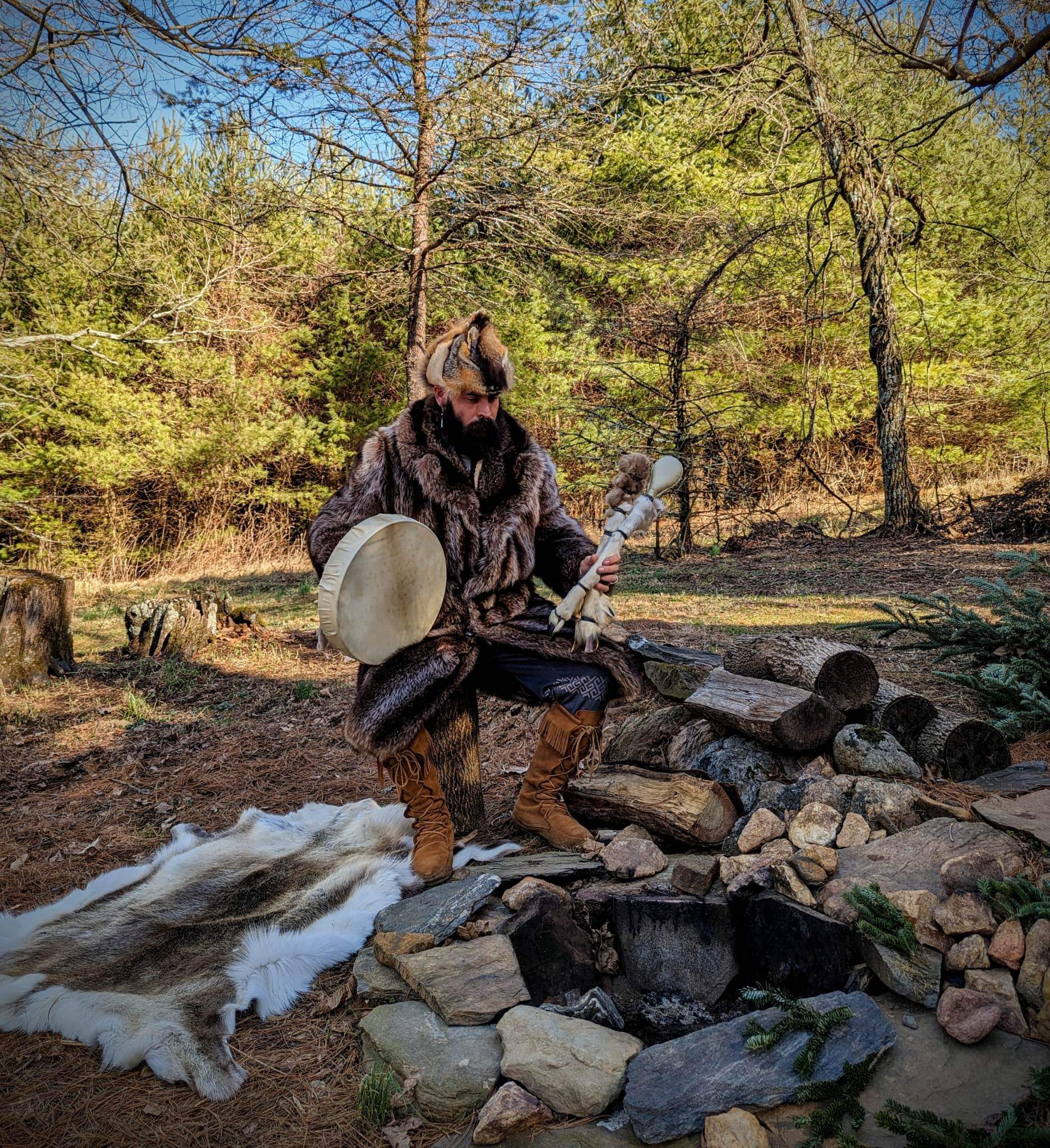 Nordic reindeer hide drum, 15" on maple frame, with white birch beater wrapped with a reindeer hide leg section with intact hoof at bottom. The beater head is finished with rabbit fur. Reindeer hide rattle is made in similar fashion, filled with Ukrainian buckwheat for a crisp therapeutic sound. Beater handle and rattle handle feature Icelandic wool ties, and the reverse side of the drum is decorated with rabbit fur strips. The reindeer hide used was sourced from Sami reindeer herders in northern Scandinavia. All animals furs and hides are from animals used for food and not killed for skins.