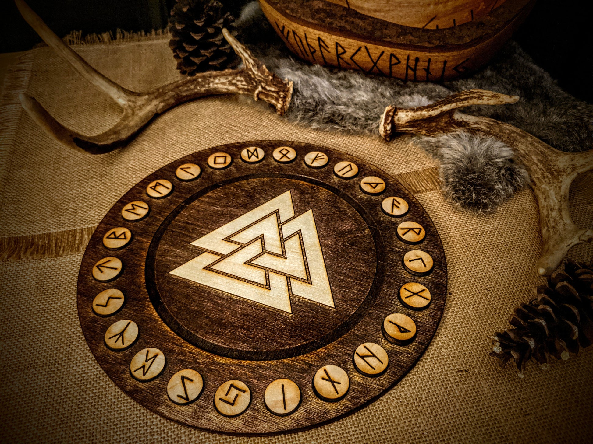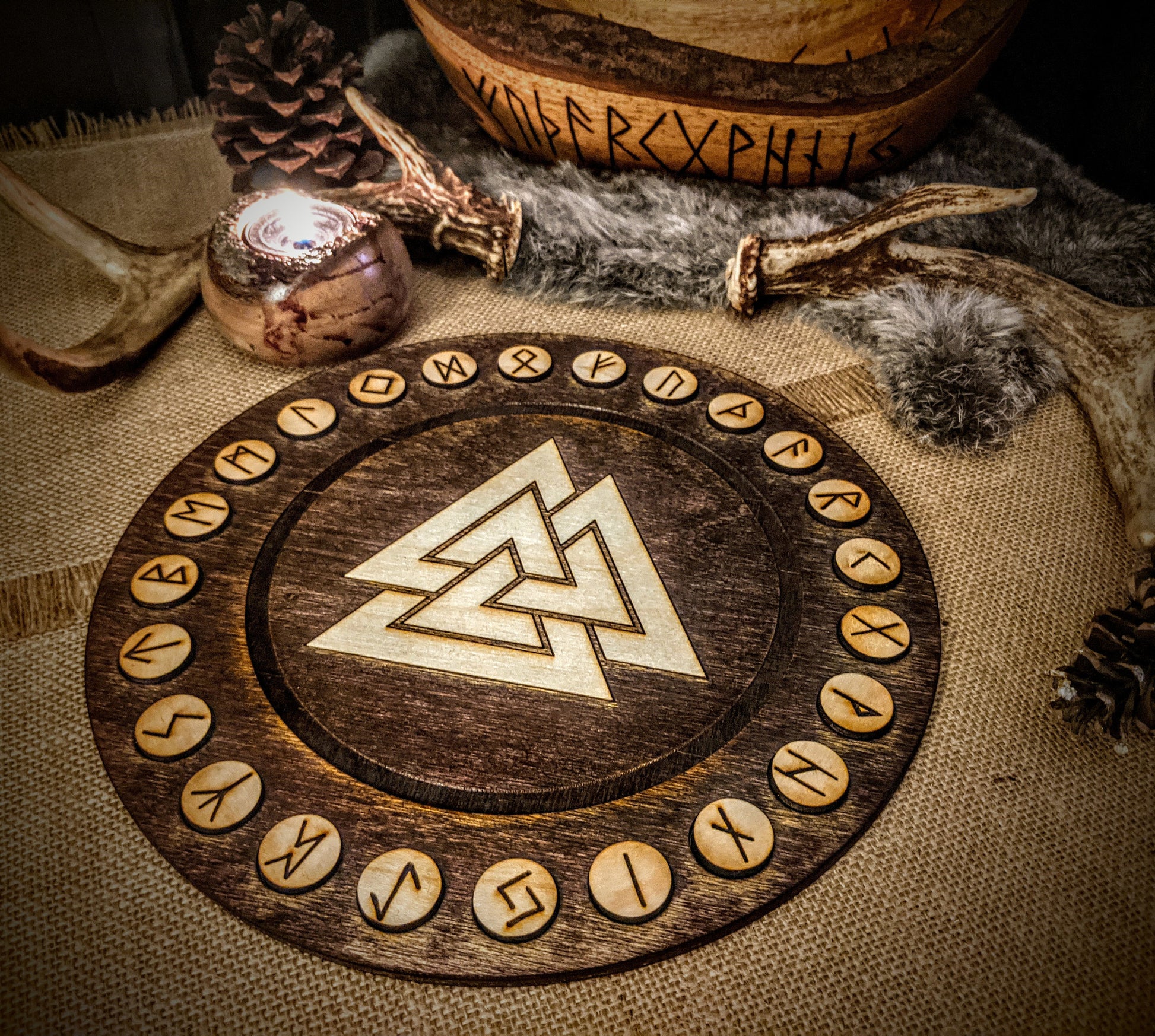 9" round birch rune set, in a recessed tray, also birch, featuring a valknut design in the center.