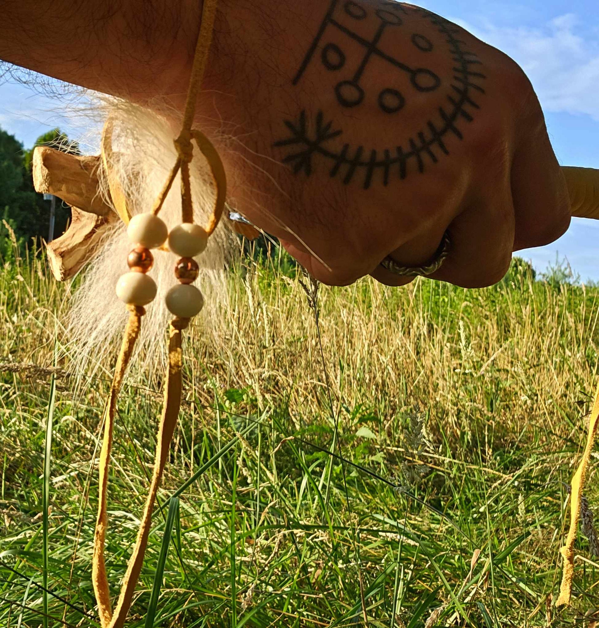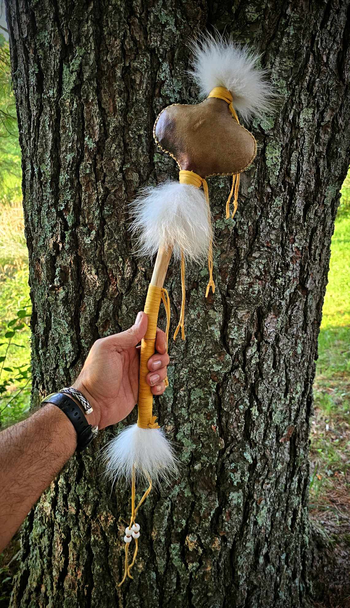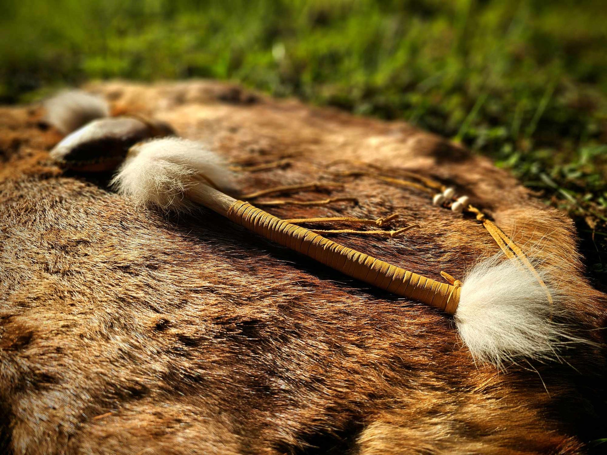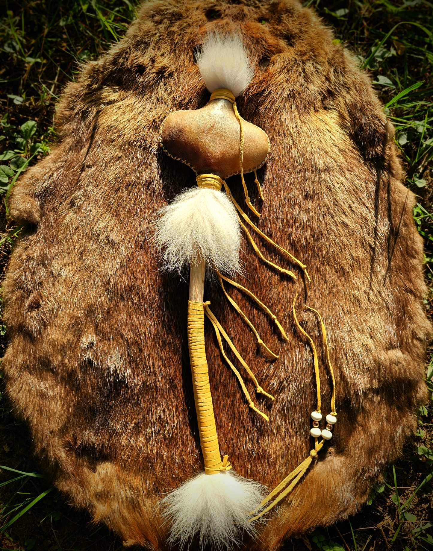 'Running Dogs' Hunt Ceremony Rattle. Cherry wood handle, Bison rawhide rattle head with buckwheat filler, white Coyote hair, buckskin, Bison bone and copper beads.