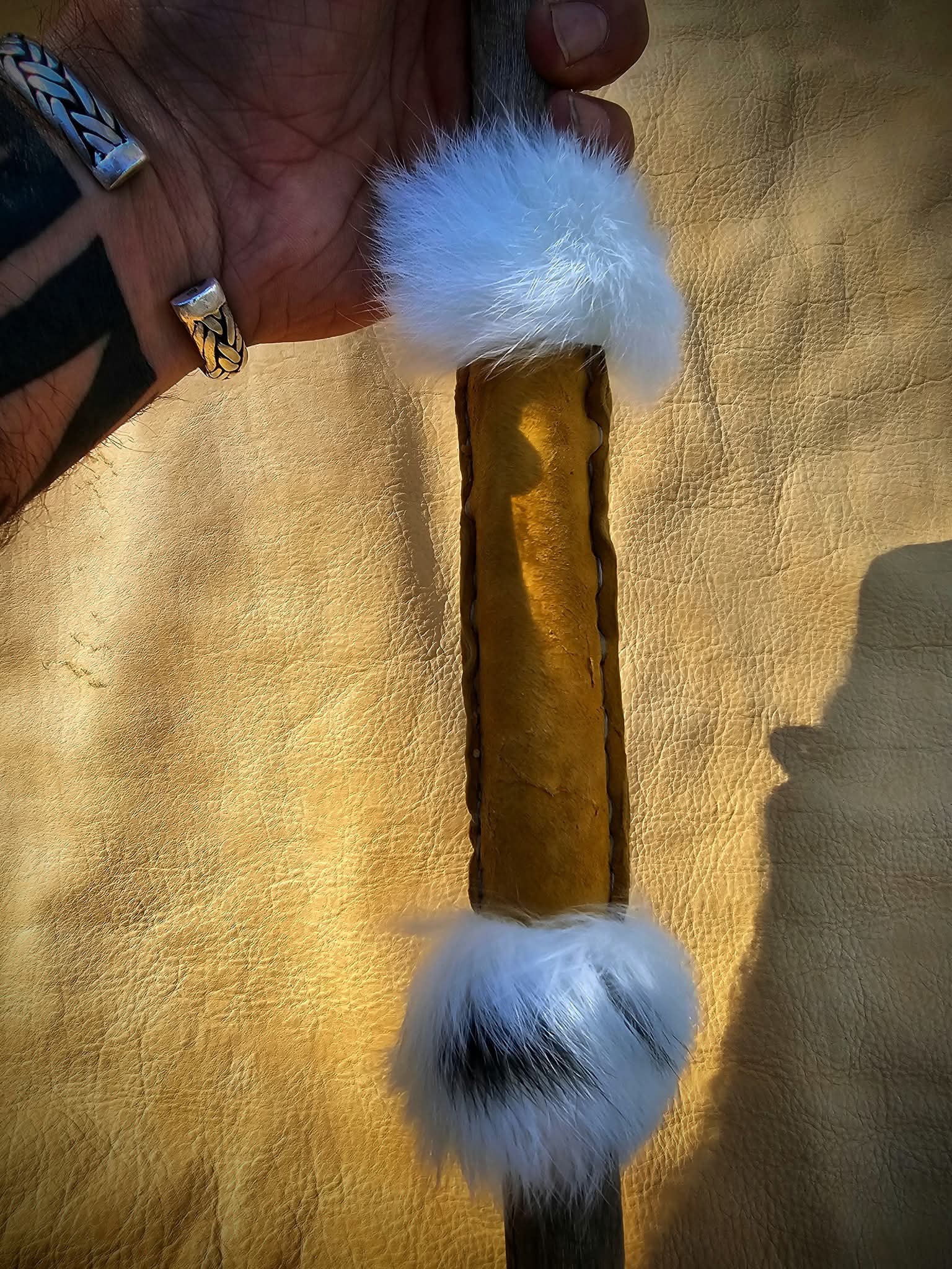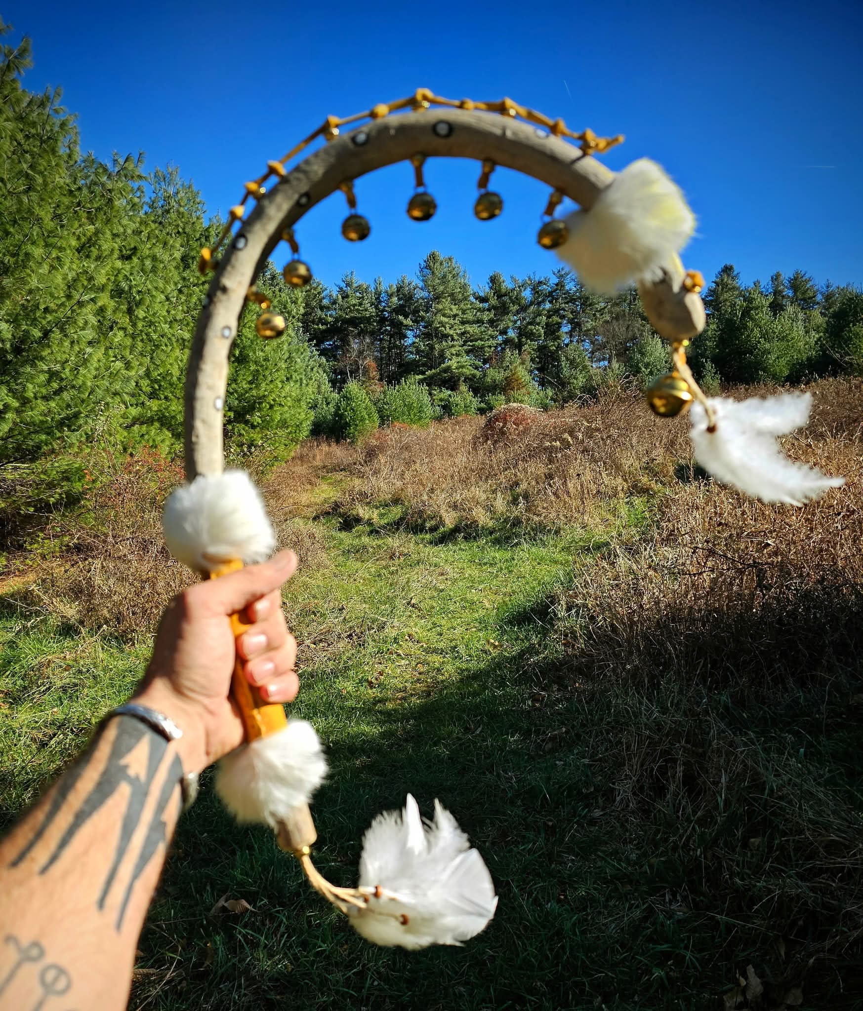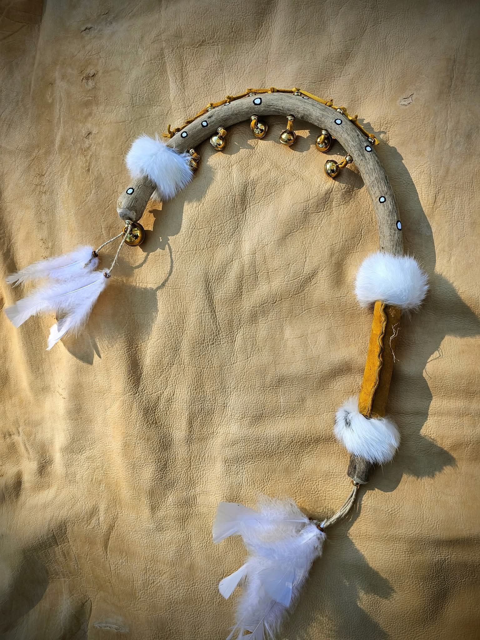 In honor of this incredible connection I set out this morning to craft a medicine stick doubling in the style of a Woodland tambourine. I've had this piece of curved New River driftwood for almost a year now waiting for the perfect spirit. Buckskin was used to lace 7 brass bells through 14 brass beads and the driftwood itself. Buckskin hand grip, and in honor of the harvest and hunt, three rabbit fur collars, and two white turkey feather tassels. The rabbit and turkey both taken respectfully for meat, honored in nothing being wasted. I used black and white oil-based paints to depict other stars in the night sky around the Seven Sisters represented by the bells.