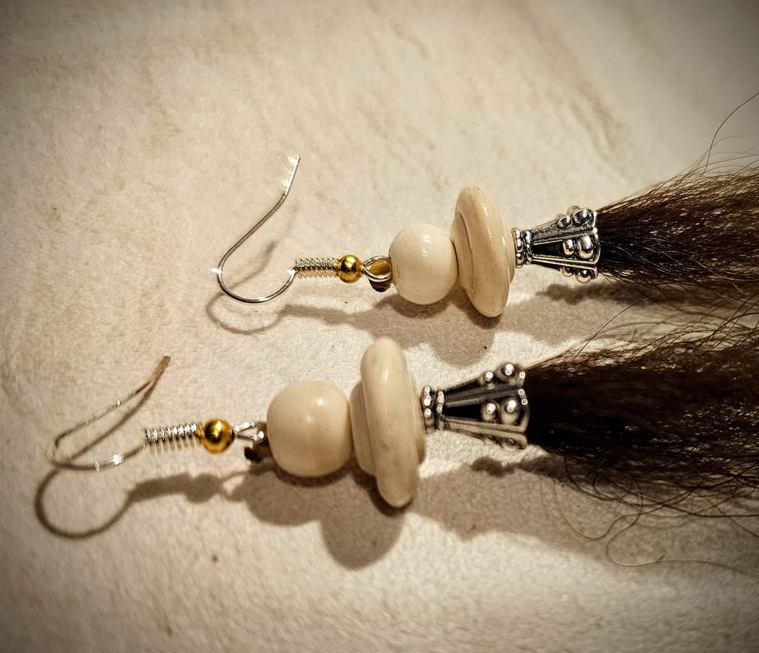 Sterling silver earwires. Bone beads and bison hair decoration.