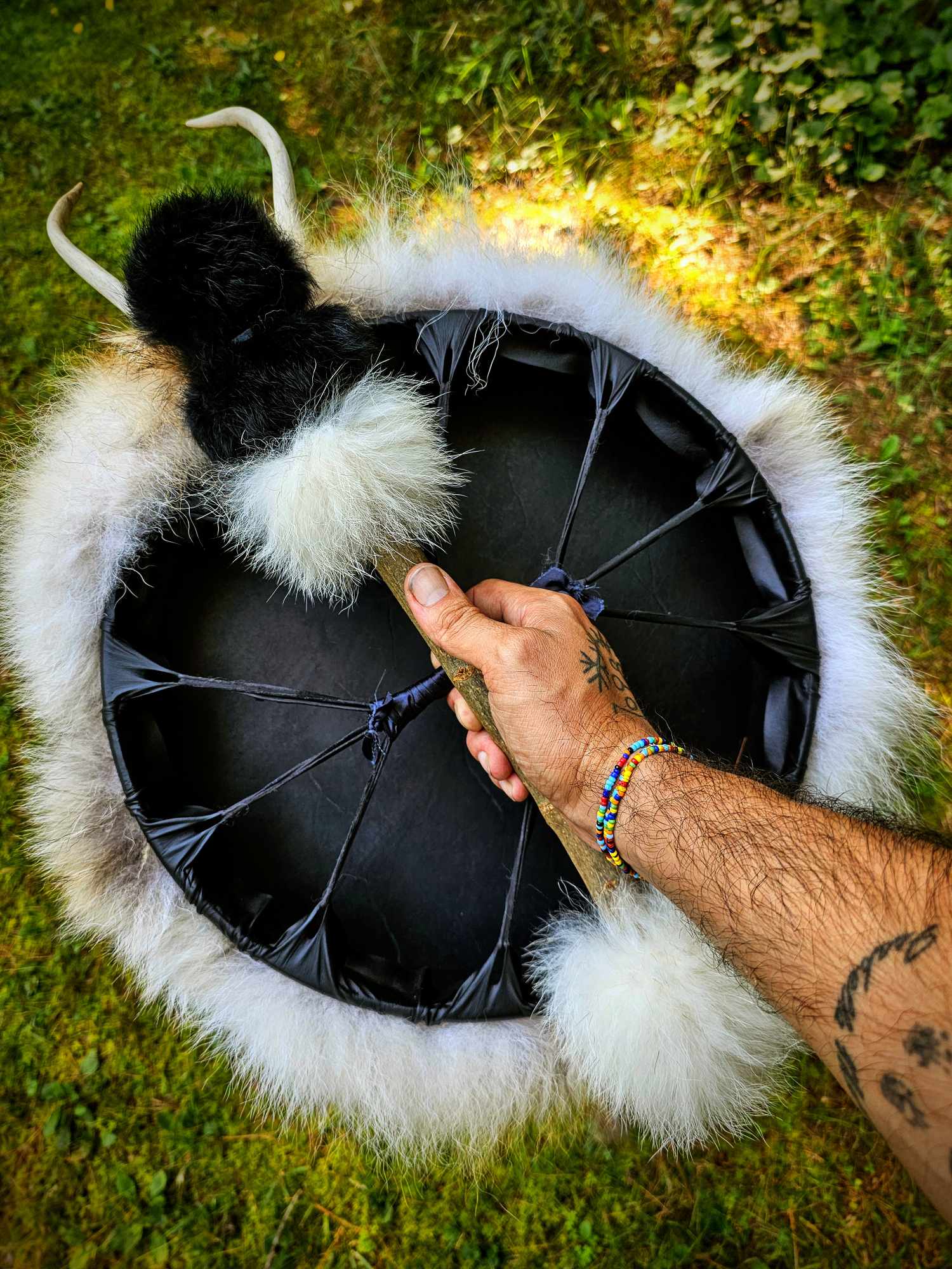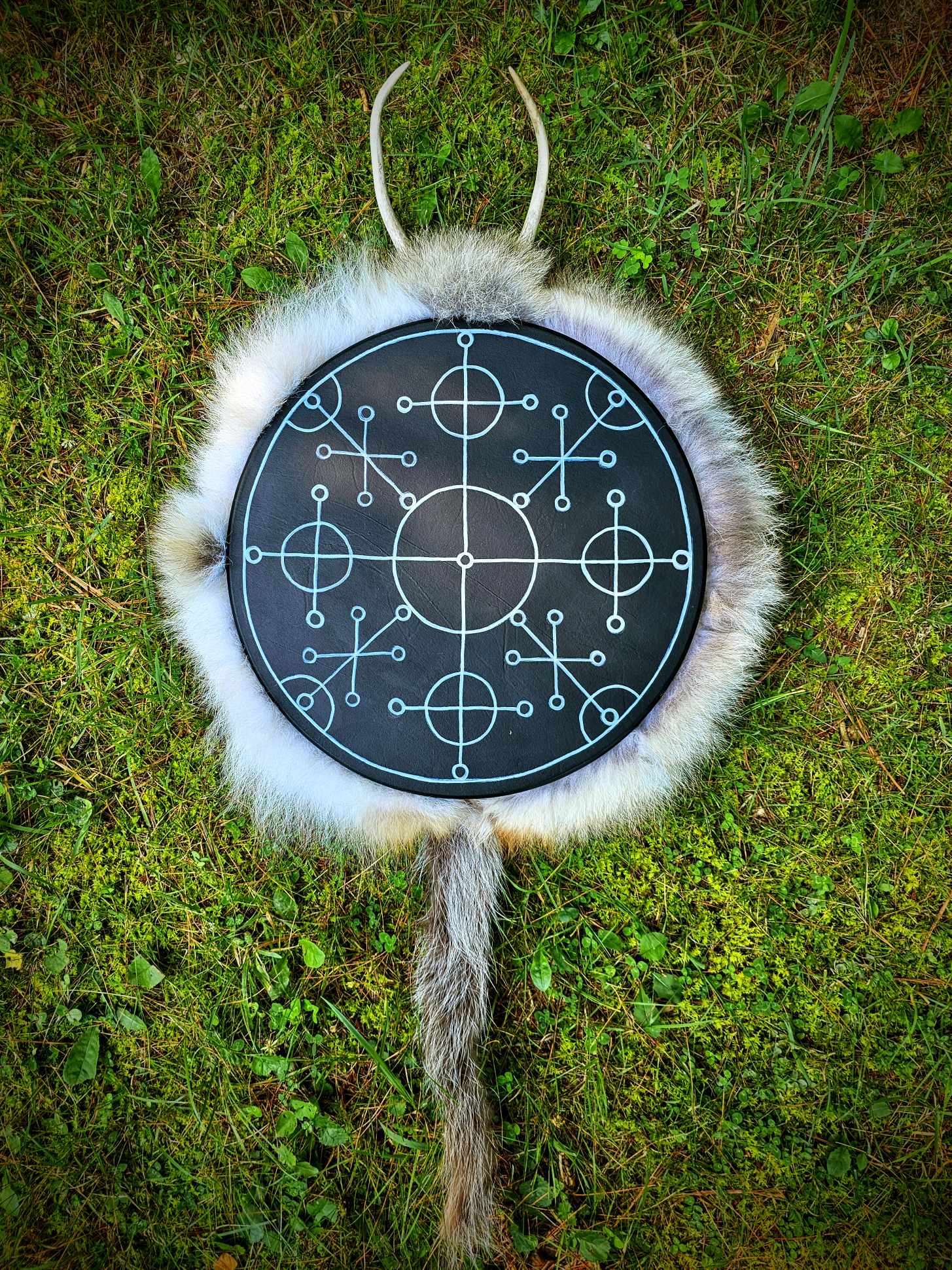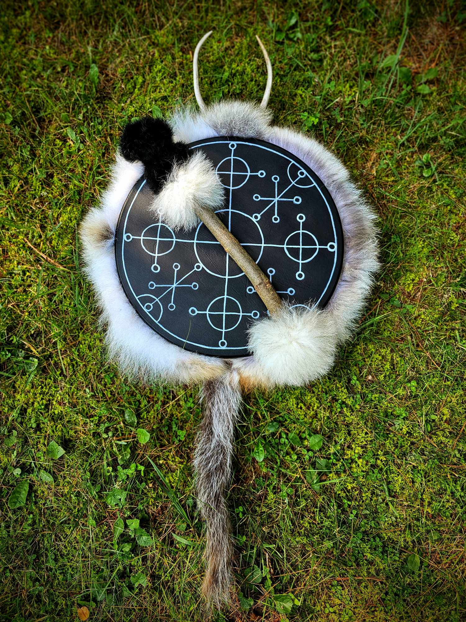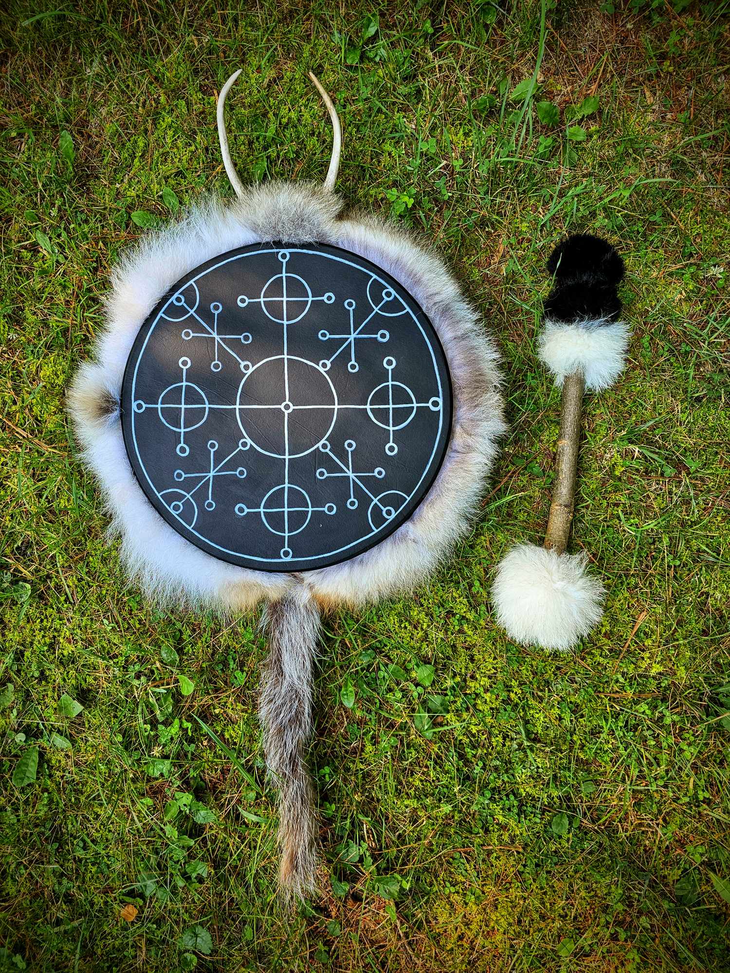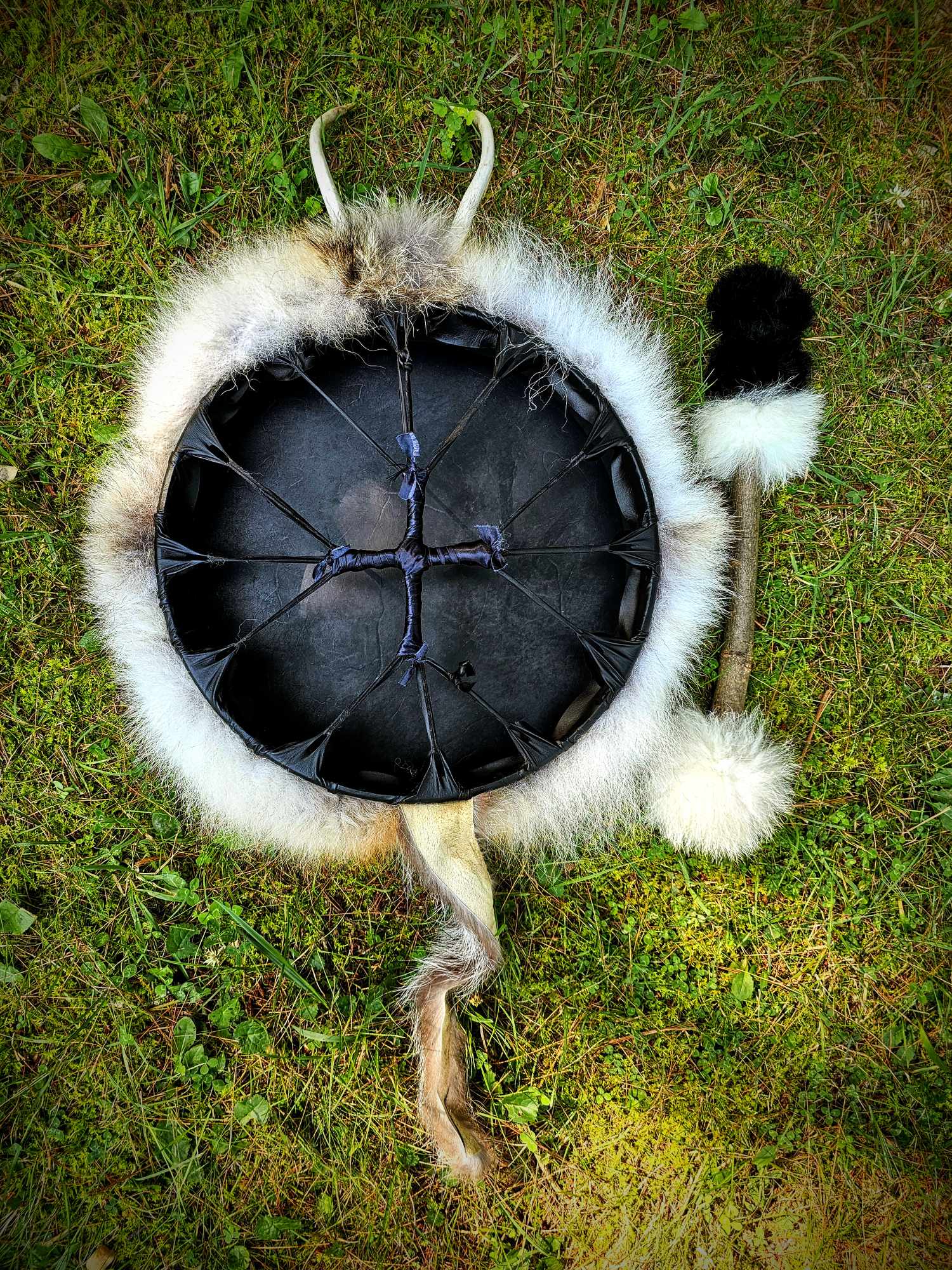 14" black dyed deer skin drum on a black maple frame. Rawhide lace, black lace handhold, Roe Deer antler/skull cap, and coyote and wolf fur trim.