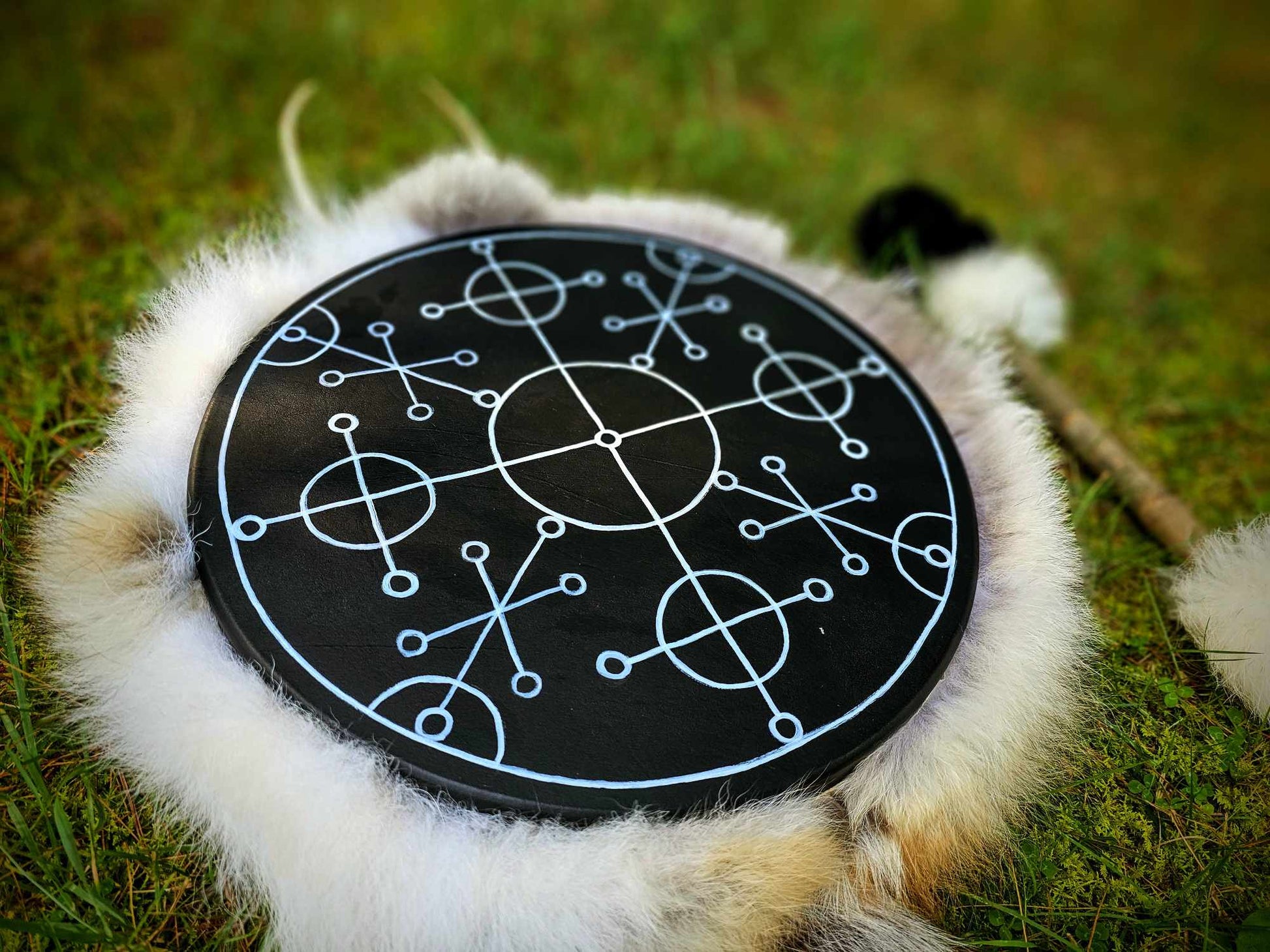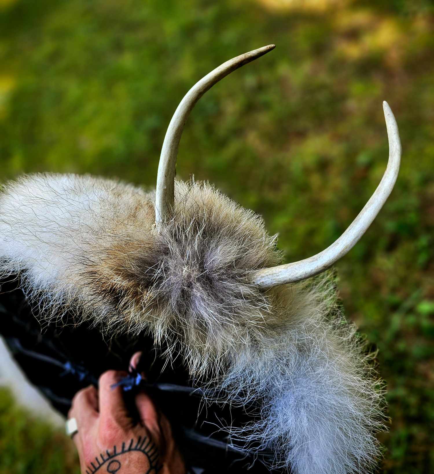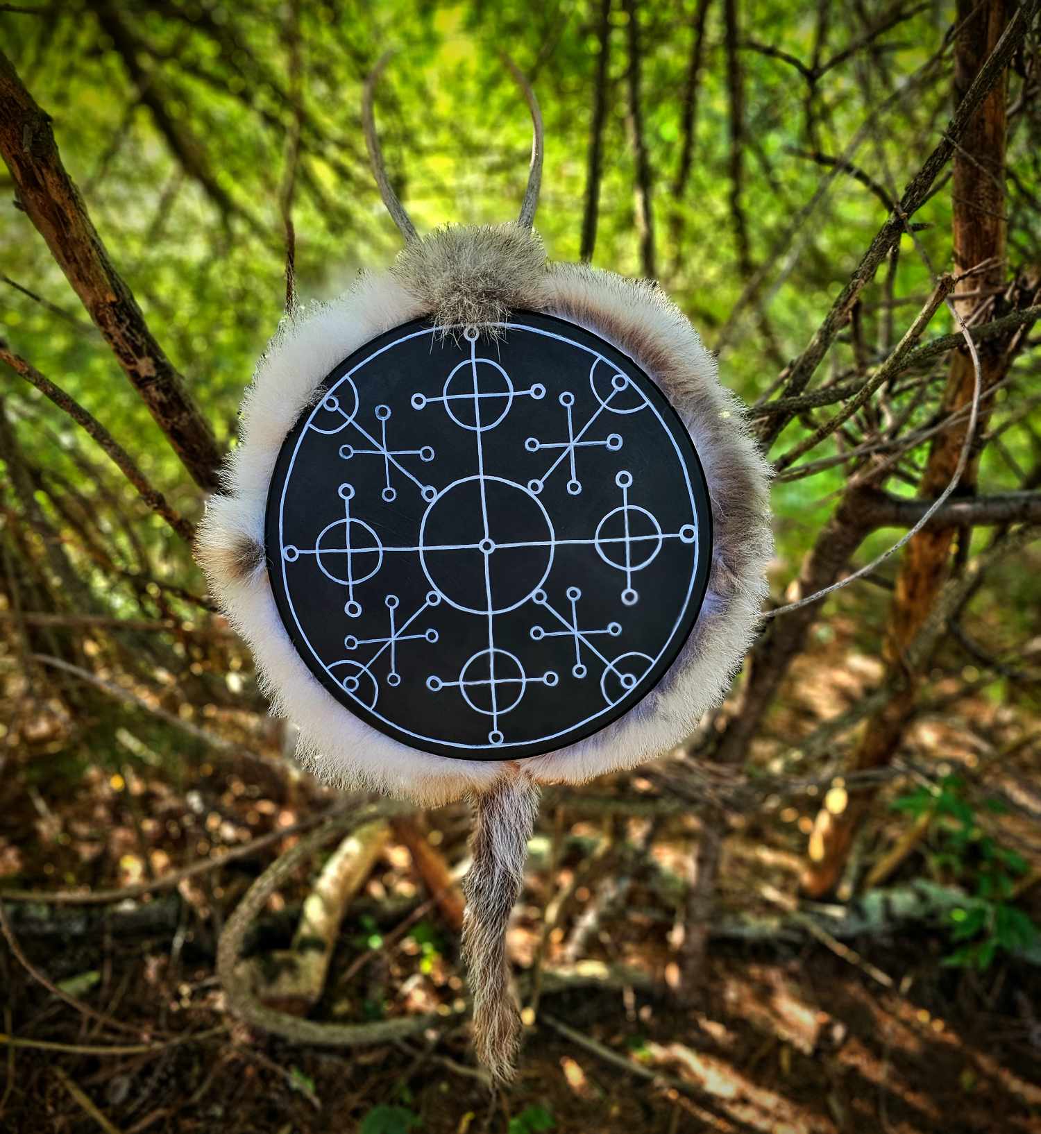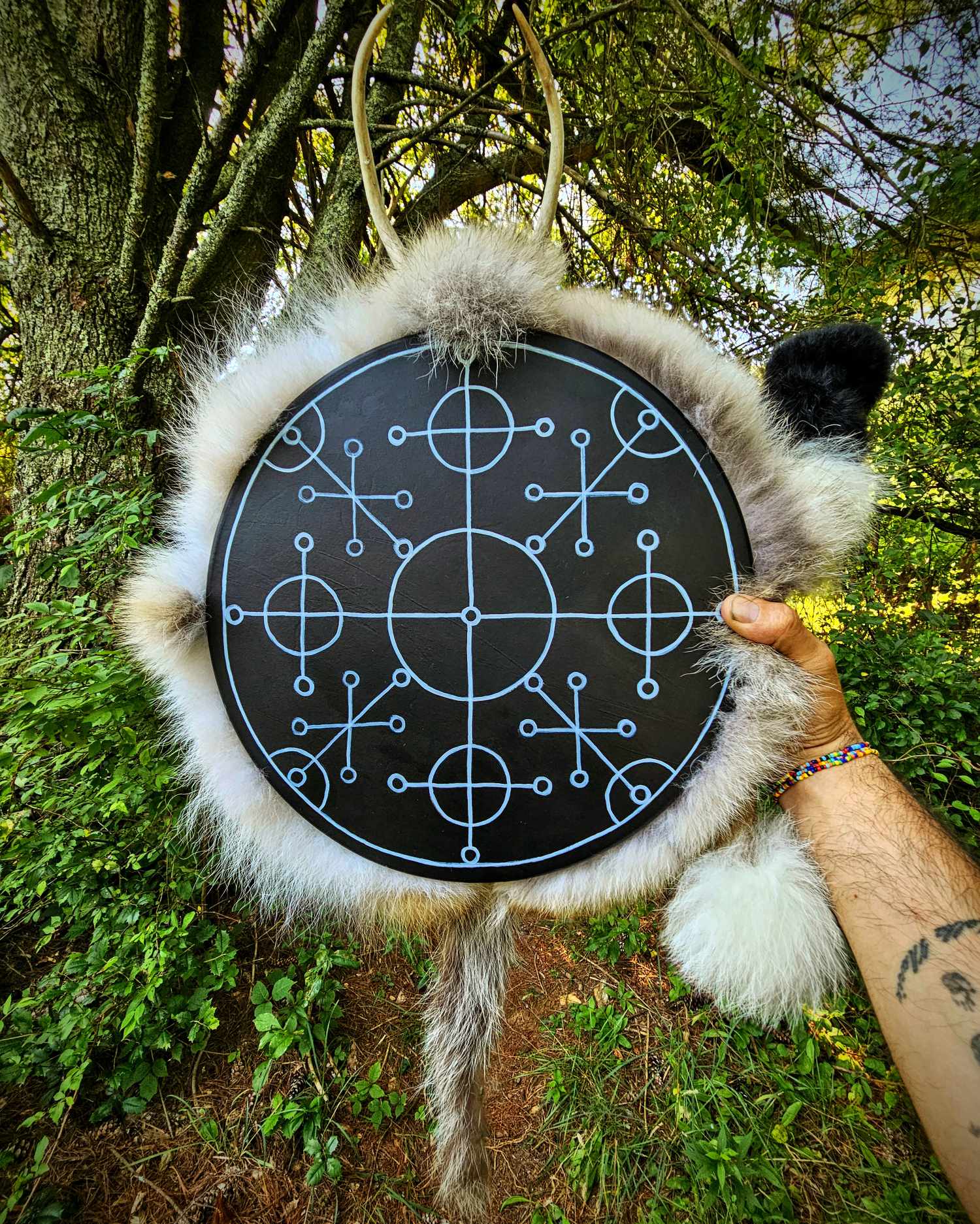 14" black dyed deer skin drum on a black maple frame. Rawhide lace, black lace handhold, Roe Deer antler/skull cap, and coyote and wolf fur trim.