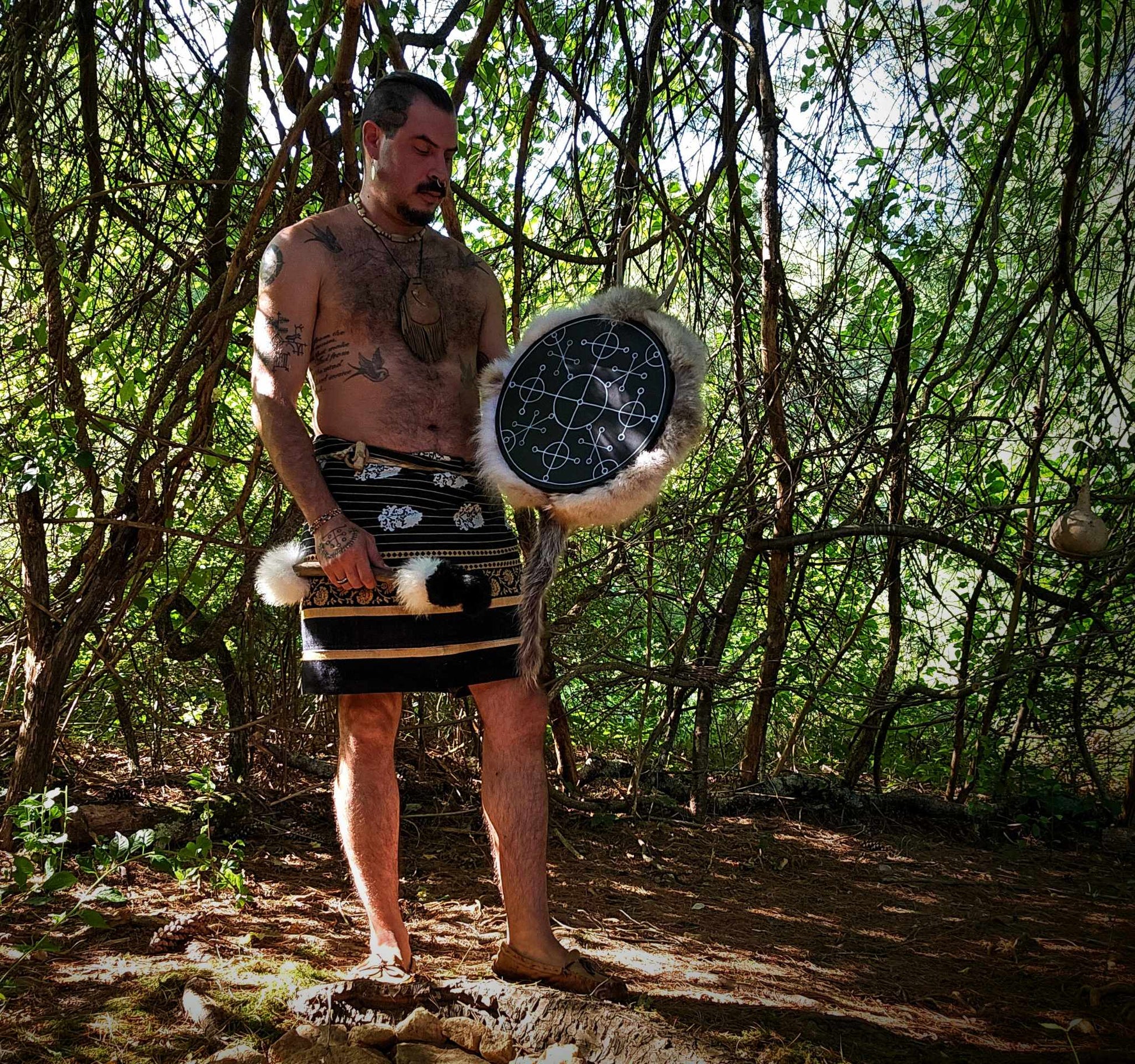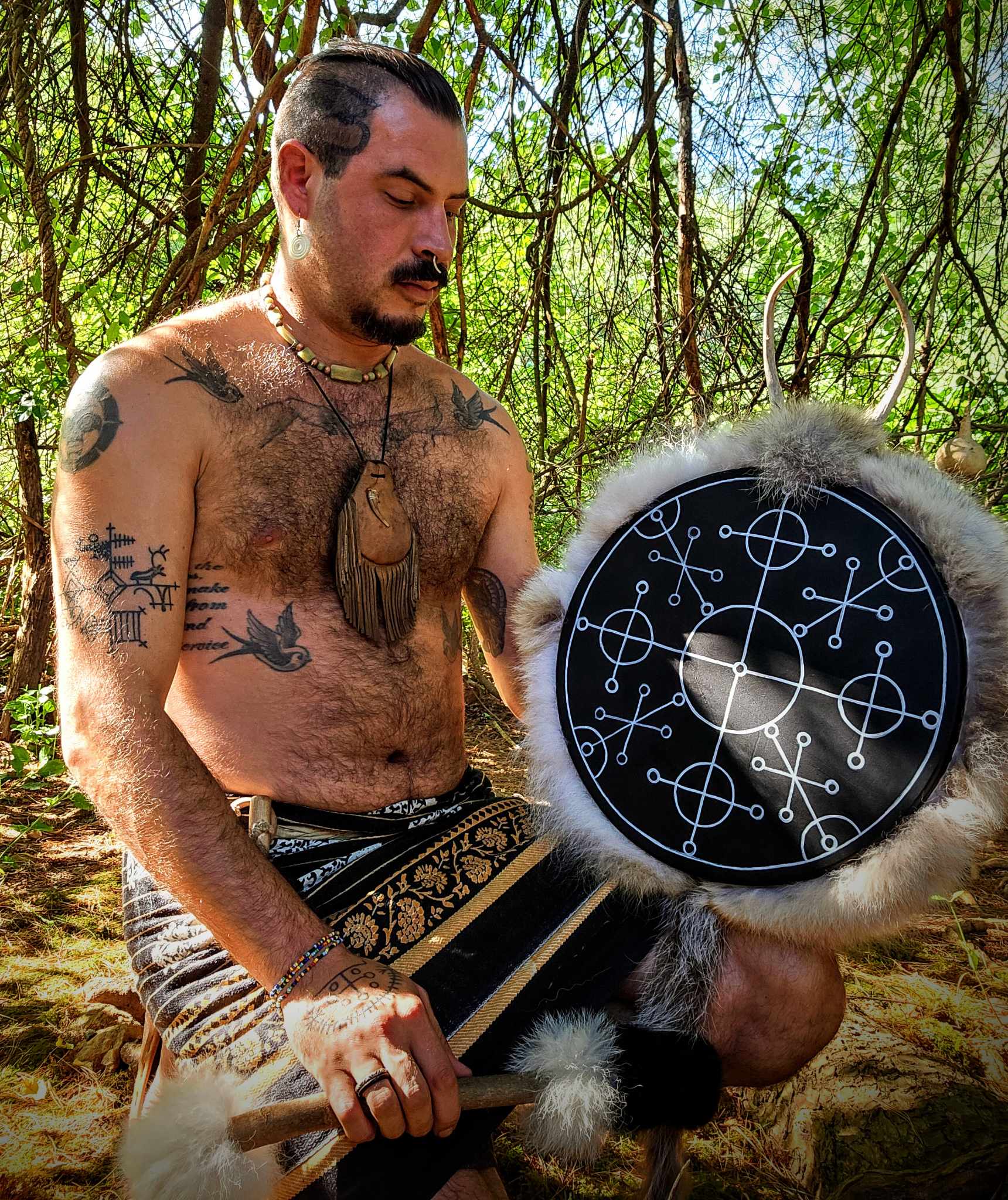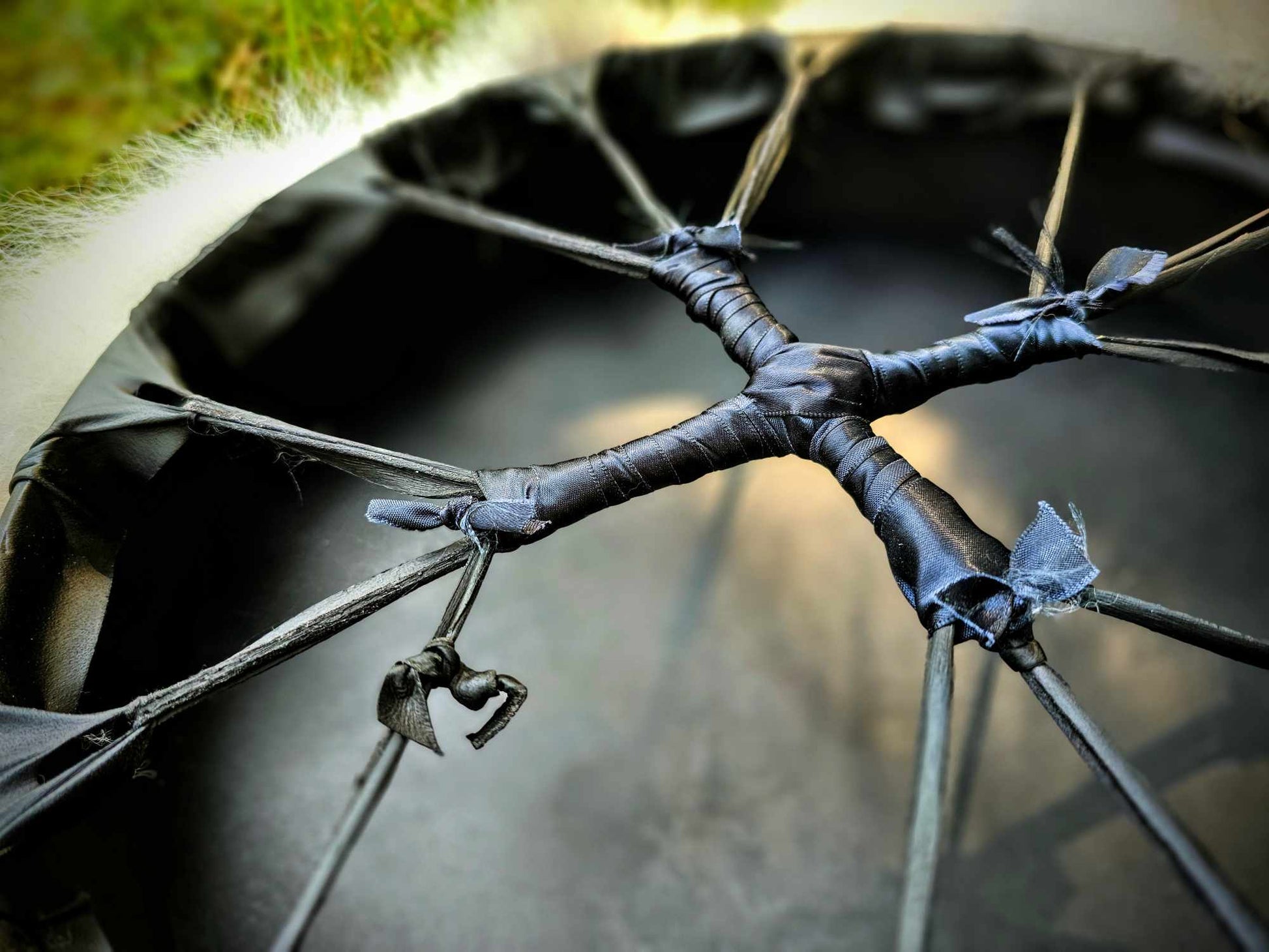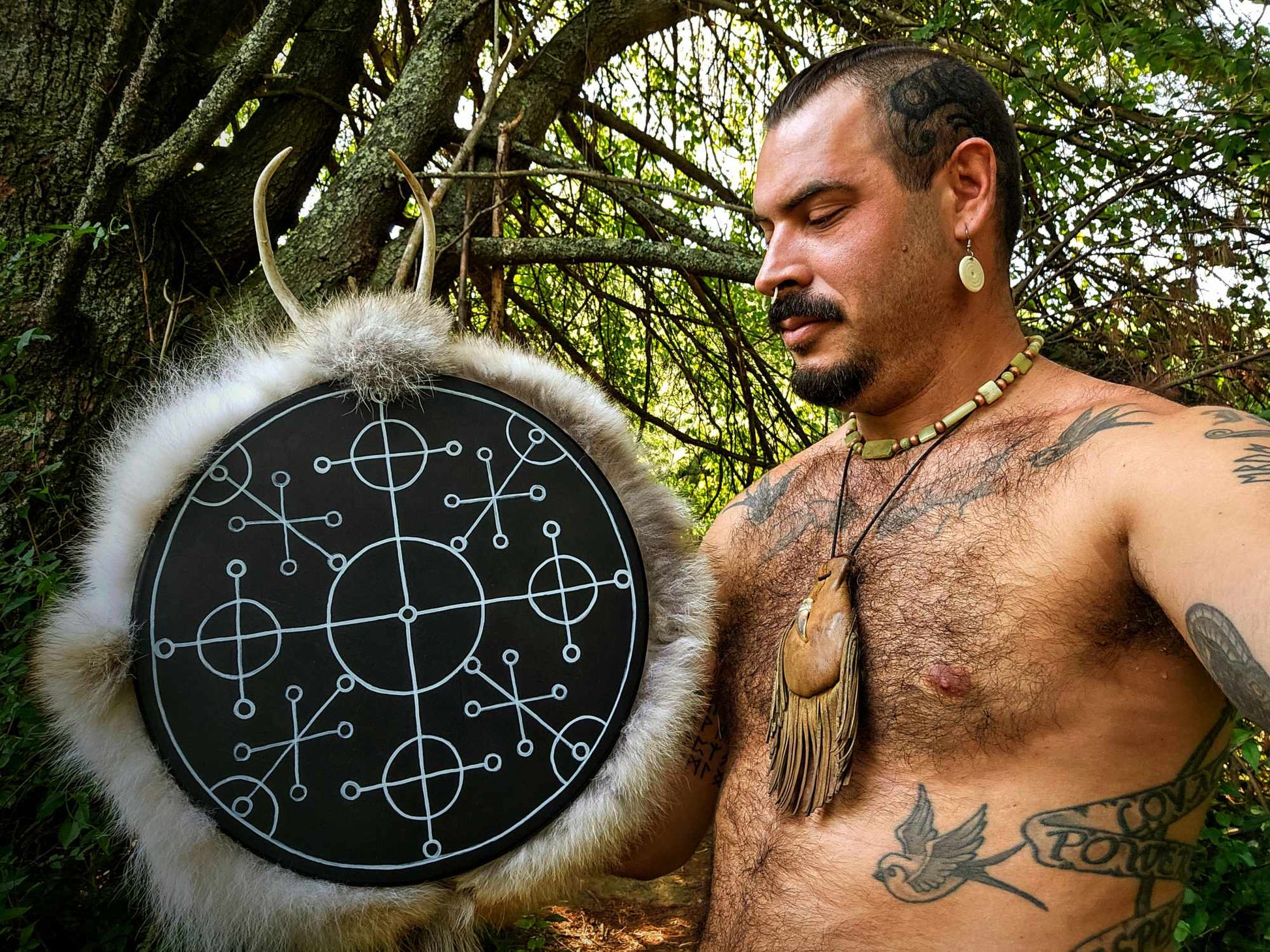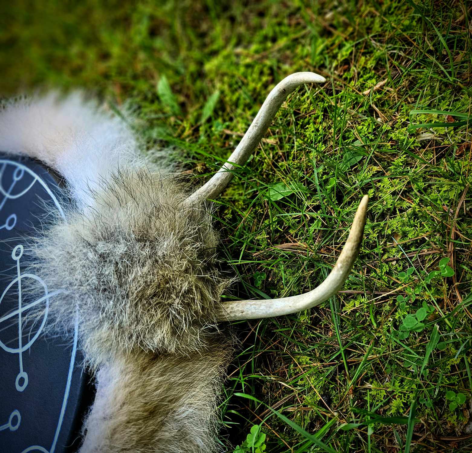 14" black dyed deer skin drum on a black maple frame. Rawhide lace, black lace handhold, Roe Deer antler/skull cap, and coyote and wolf fur trim.