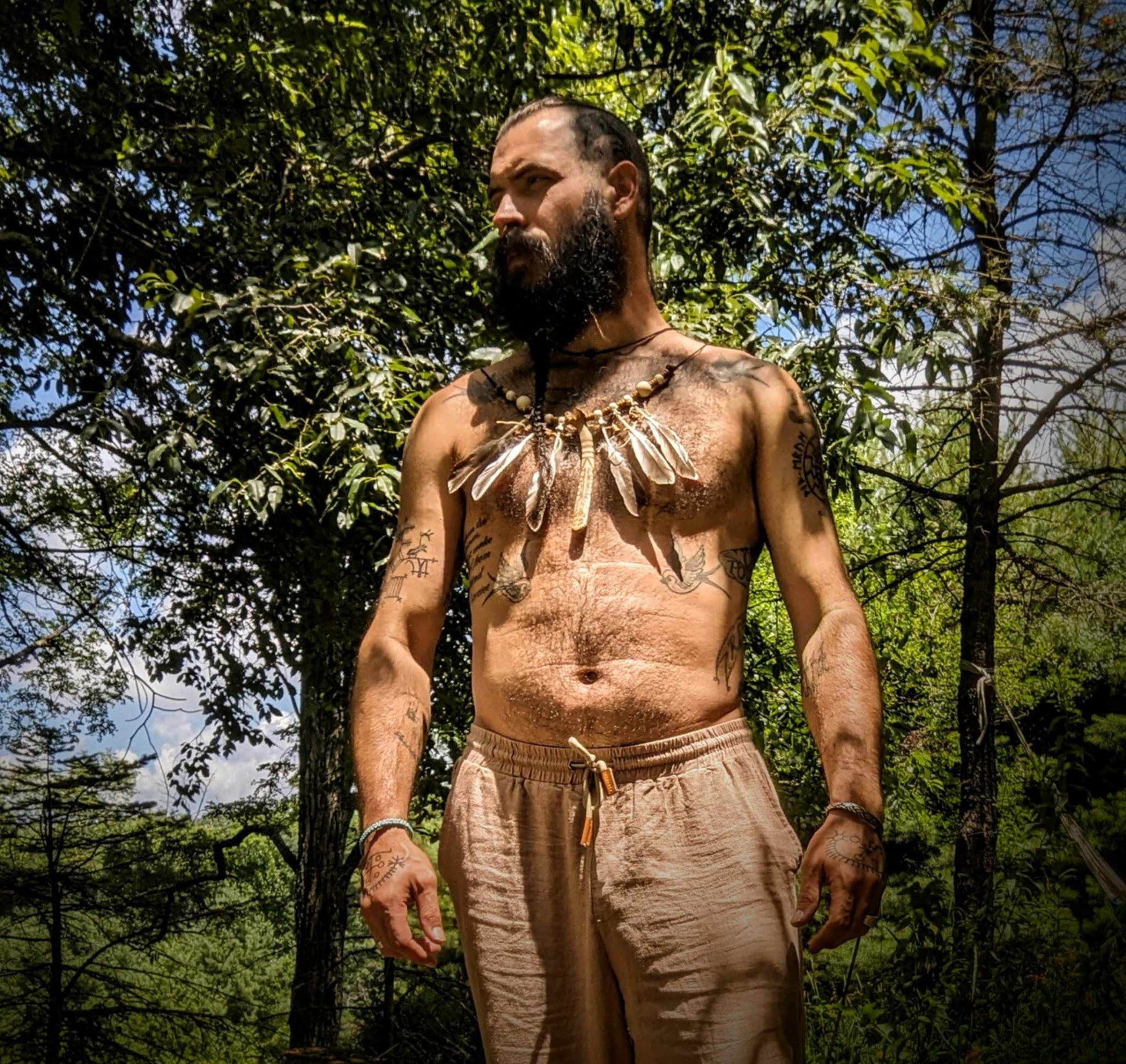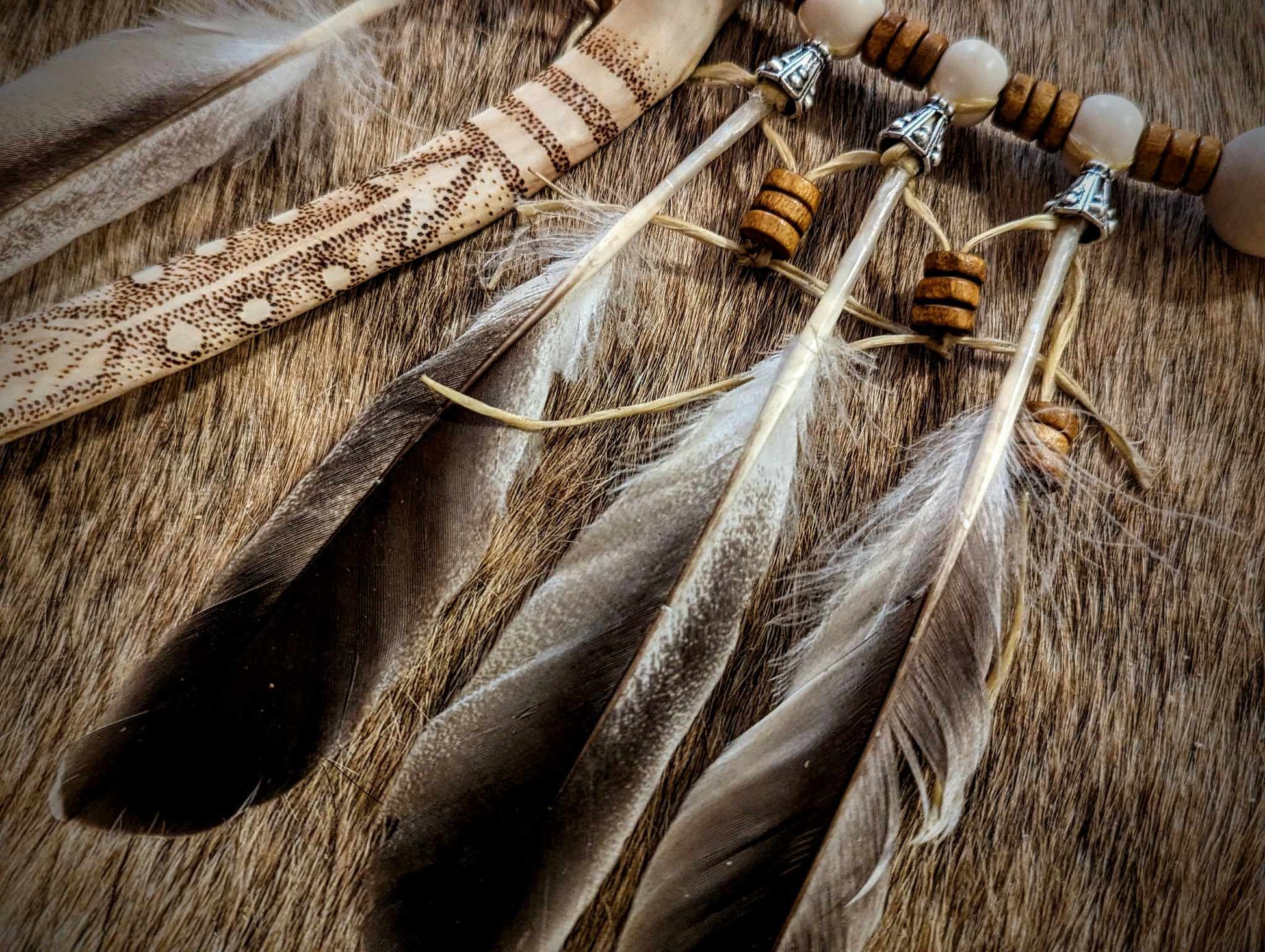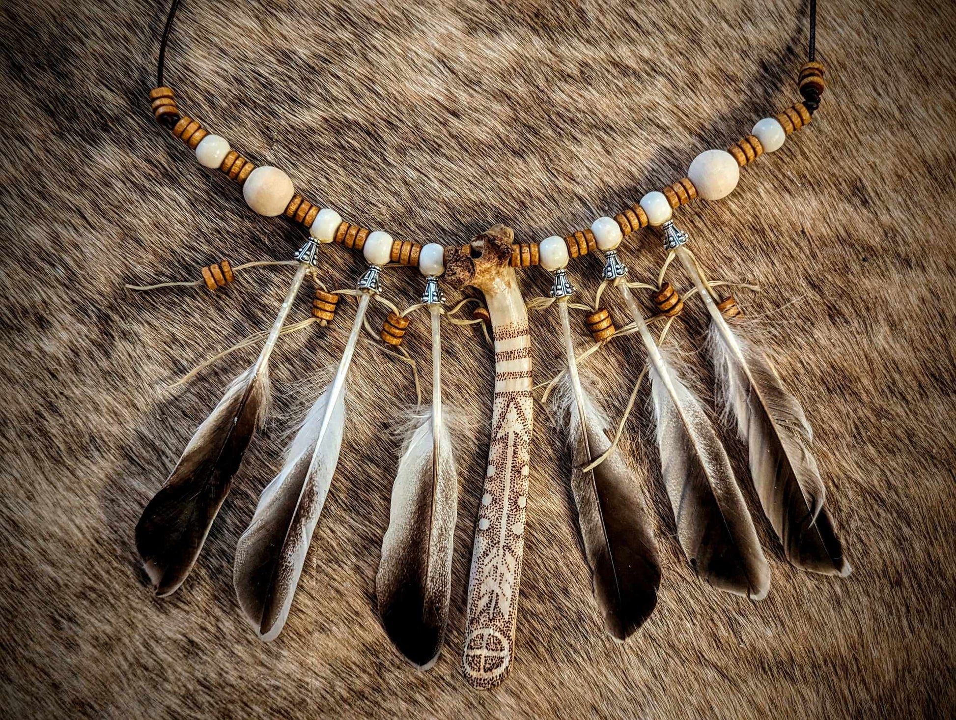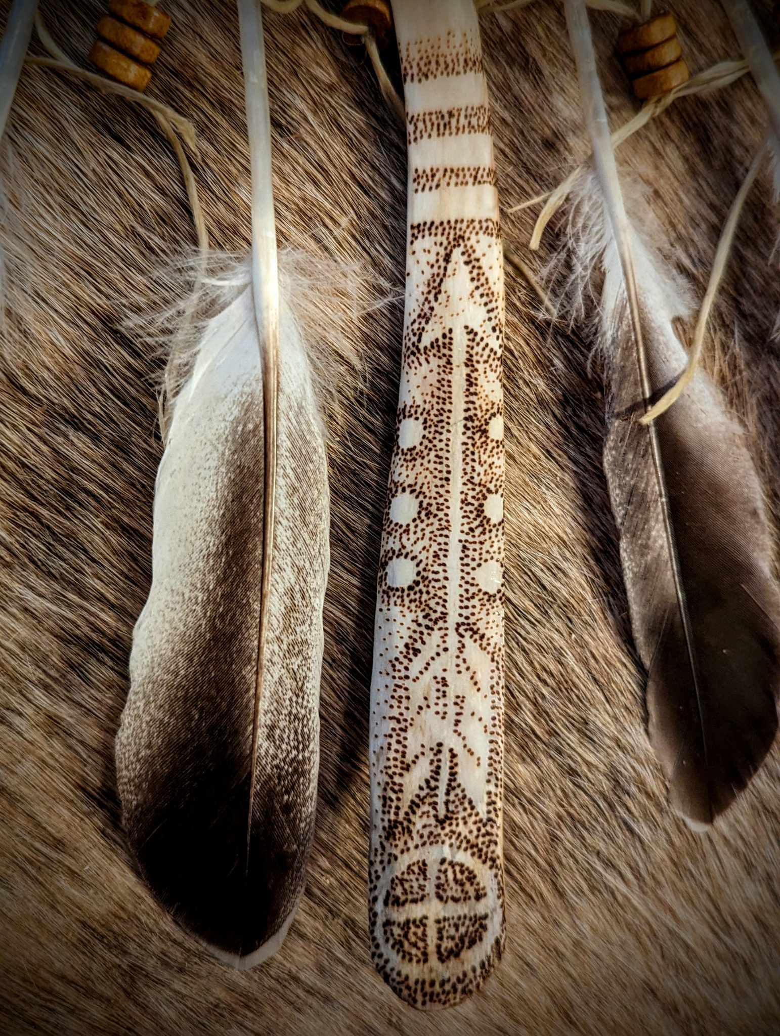 Leather cord necklace featuring a whitetail deer rib bone that has been hand burnee with a sunwheel, an arrow, 6 circles, and 3 lines. It is finished with wood and bone beads, cone beads, and 6 duck feathers.