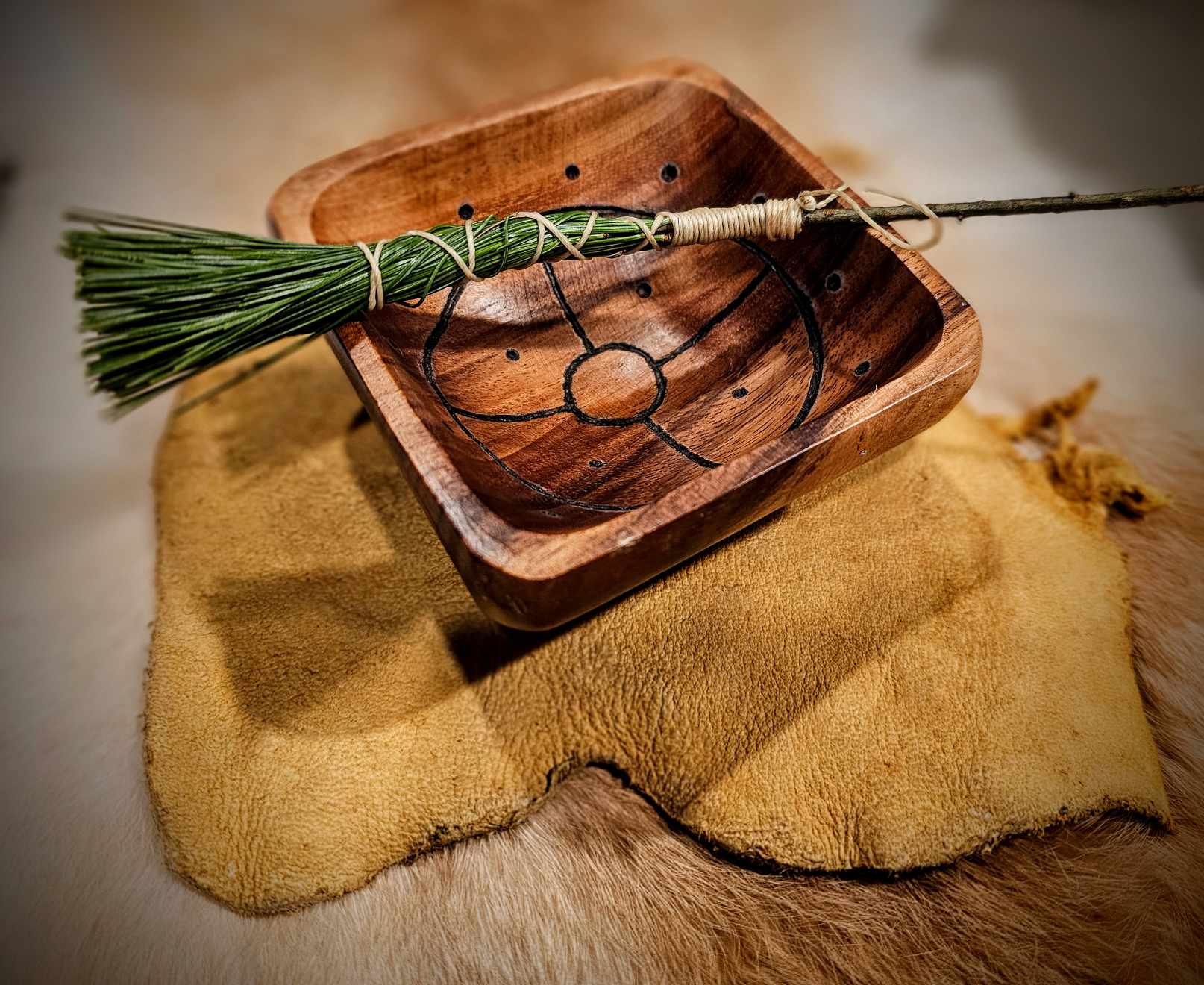 4 inch carved wood bowl with hand burned sunwheel design. Use to hold small objects, as an altar fixture, or as a portable blot bowl. Food safe. Holds approximately four fluid ounces.