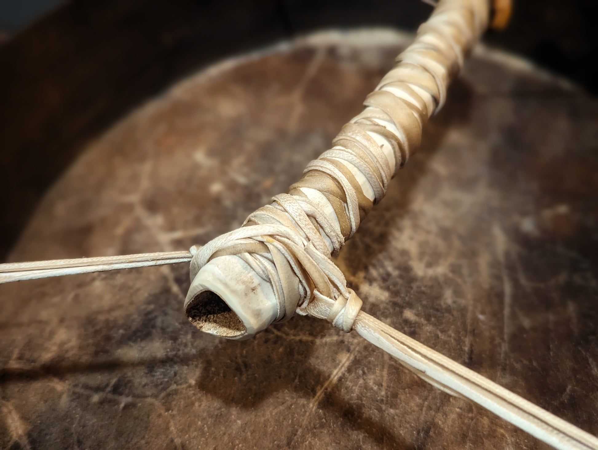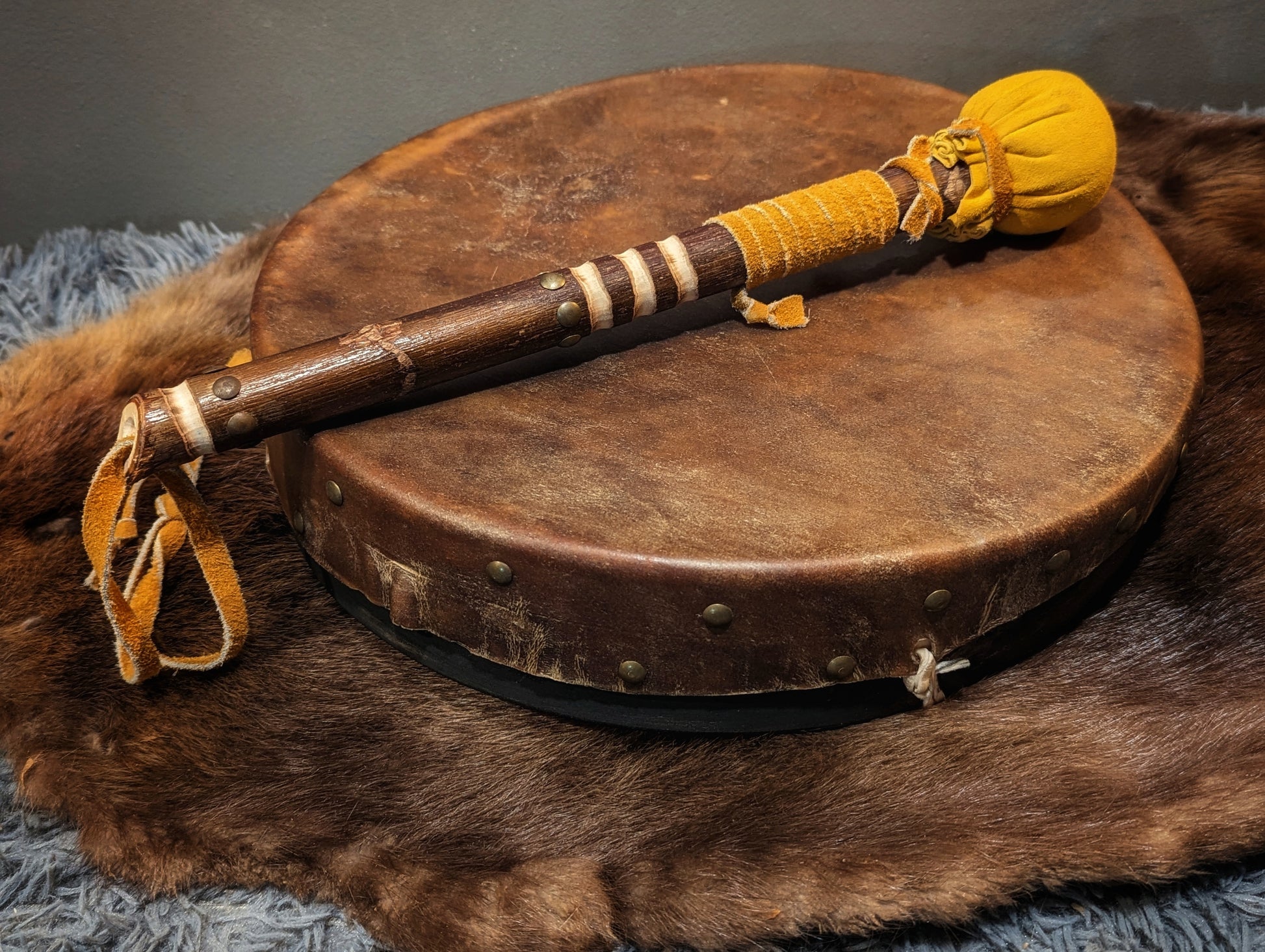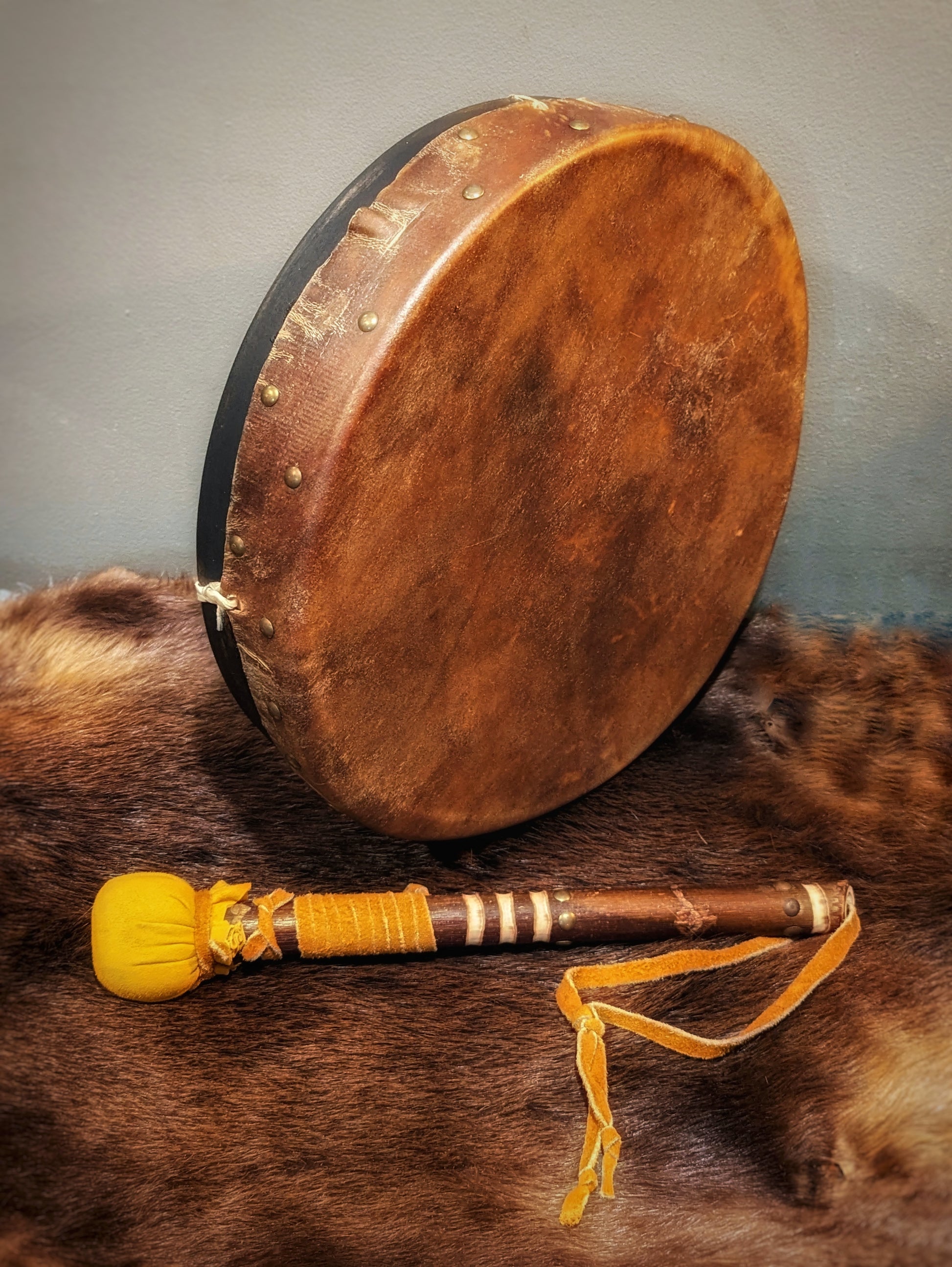 Primitive Bison Hide brass tacked 14" drum, with deer bone and rawhide lace handhold. Ultra thick hide maintains its usability in high heat and high humidity environments. Beater is made from carved alder branch, fleece and buckskin head with brass tack embellishment.