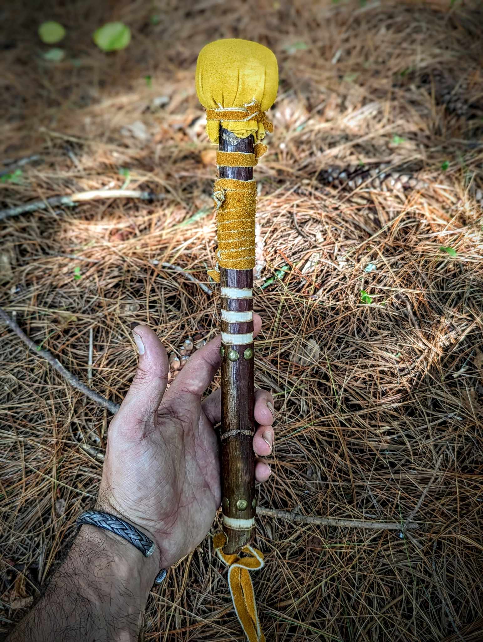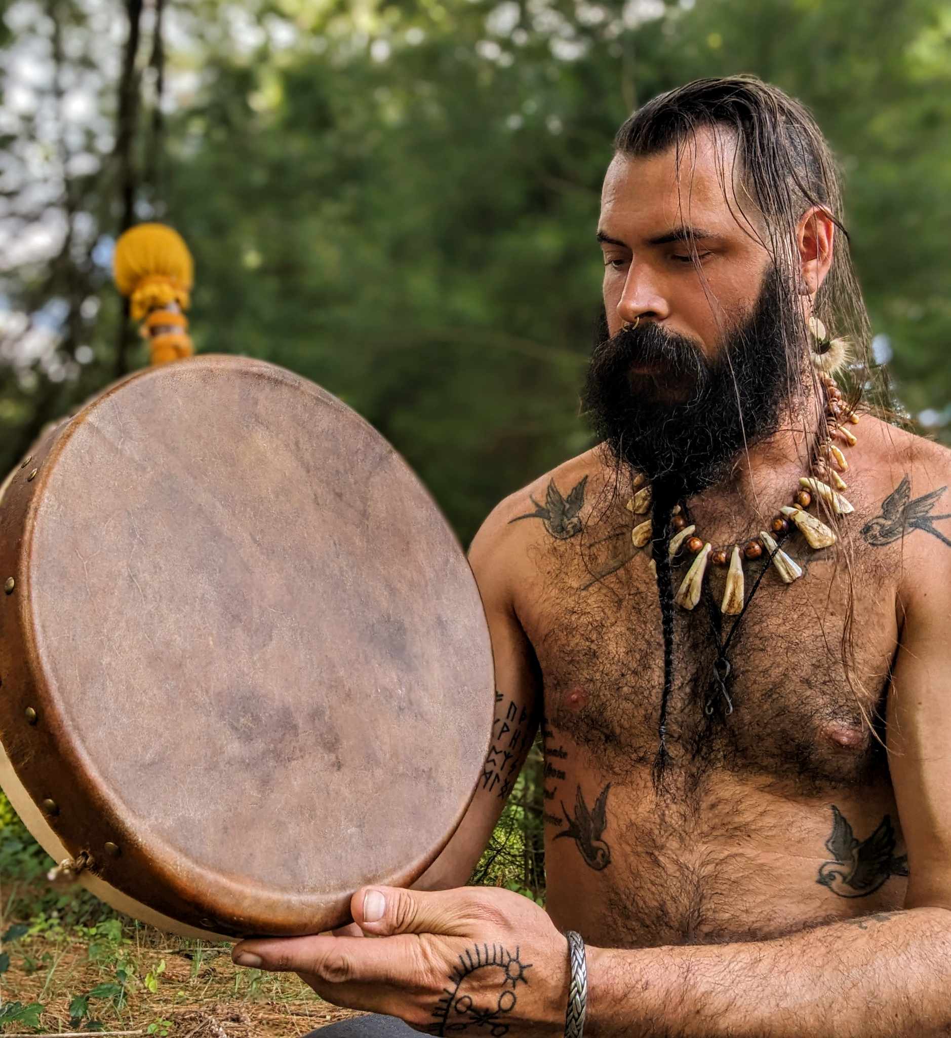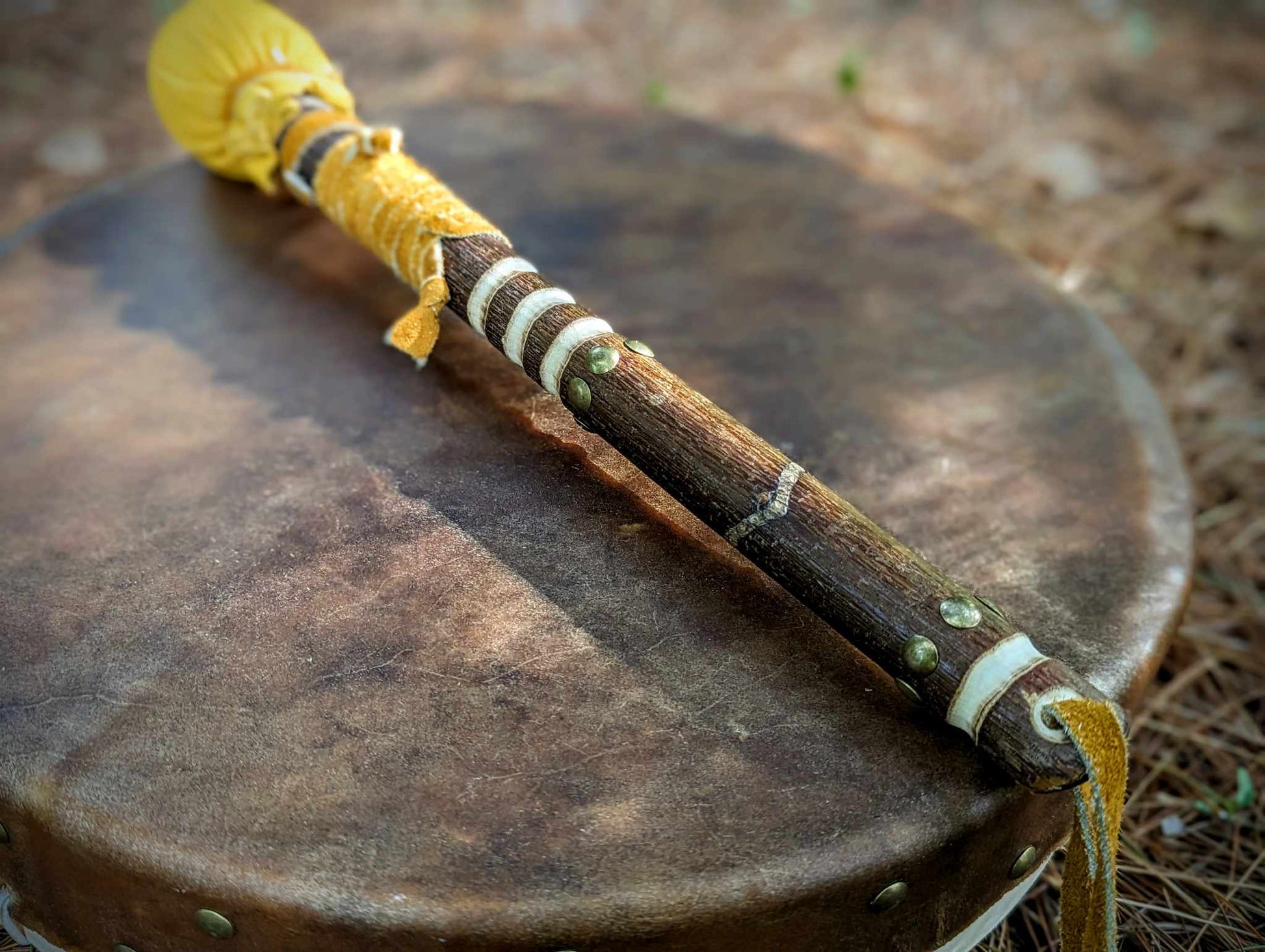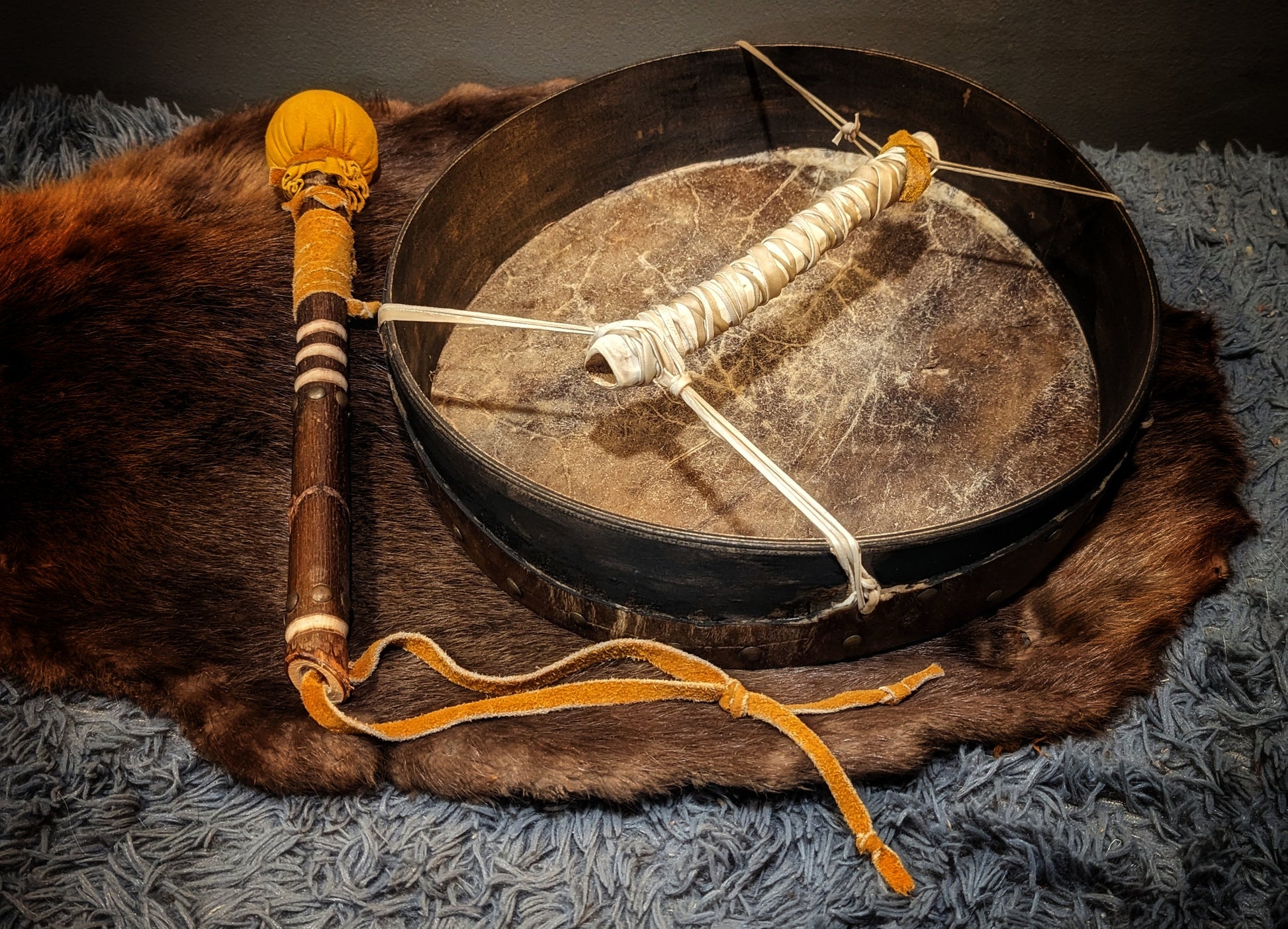Primitive Bison Hide brass tacked 14" drum, with deer bone and rawhide lace handhold. Ultra thick hide maintains its usability in high heat and high humidity environments. Beater is made from carved alder branch, fleece and buckskin head with brass tack embellishment.