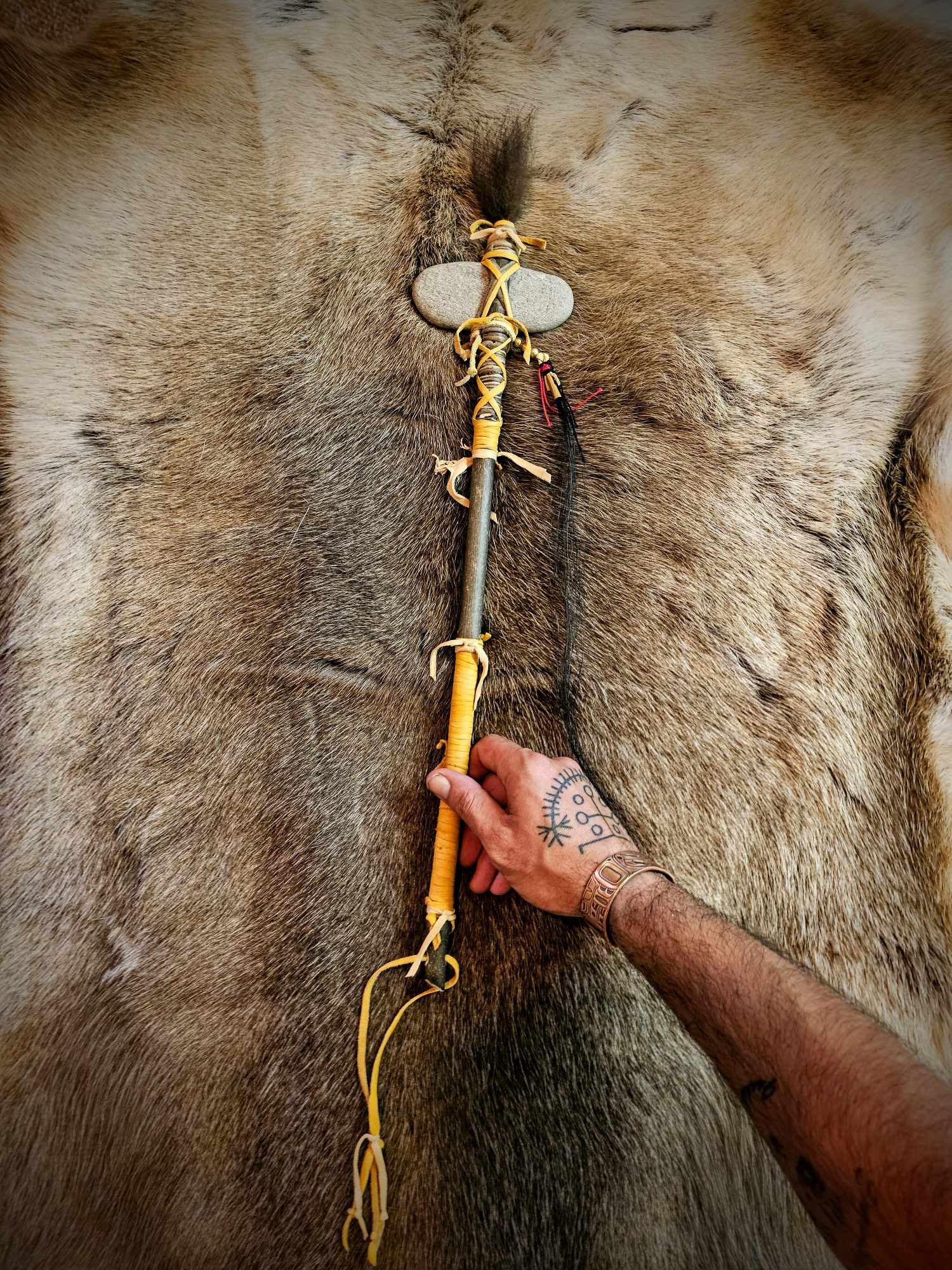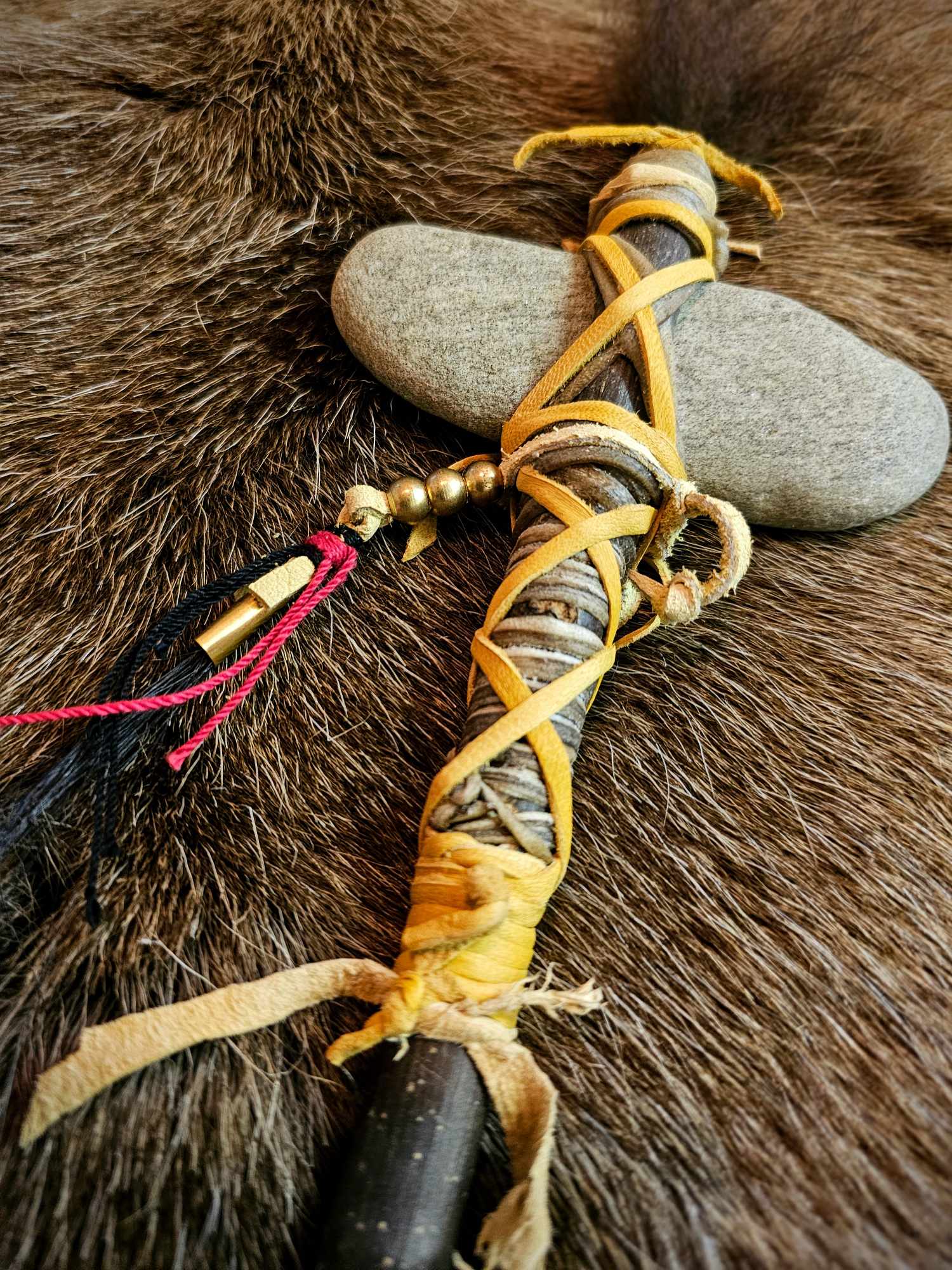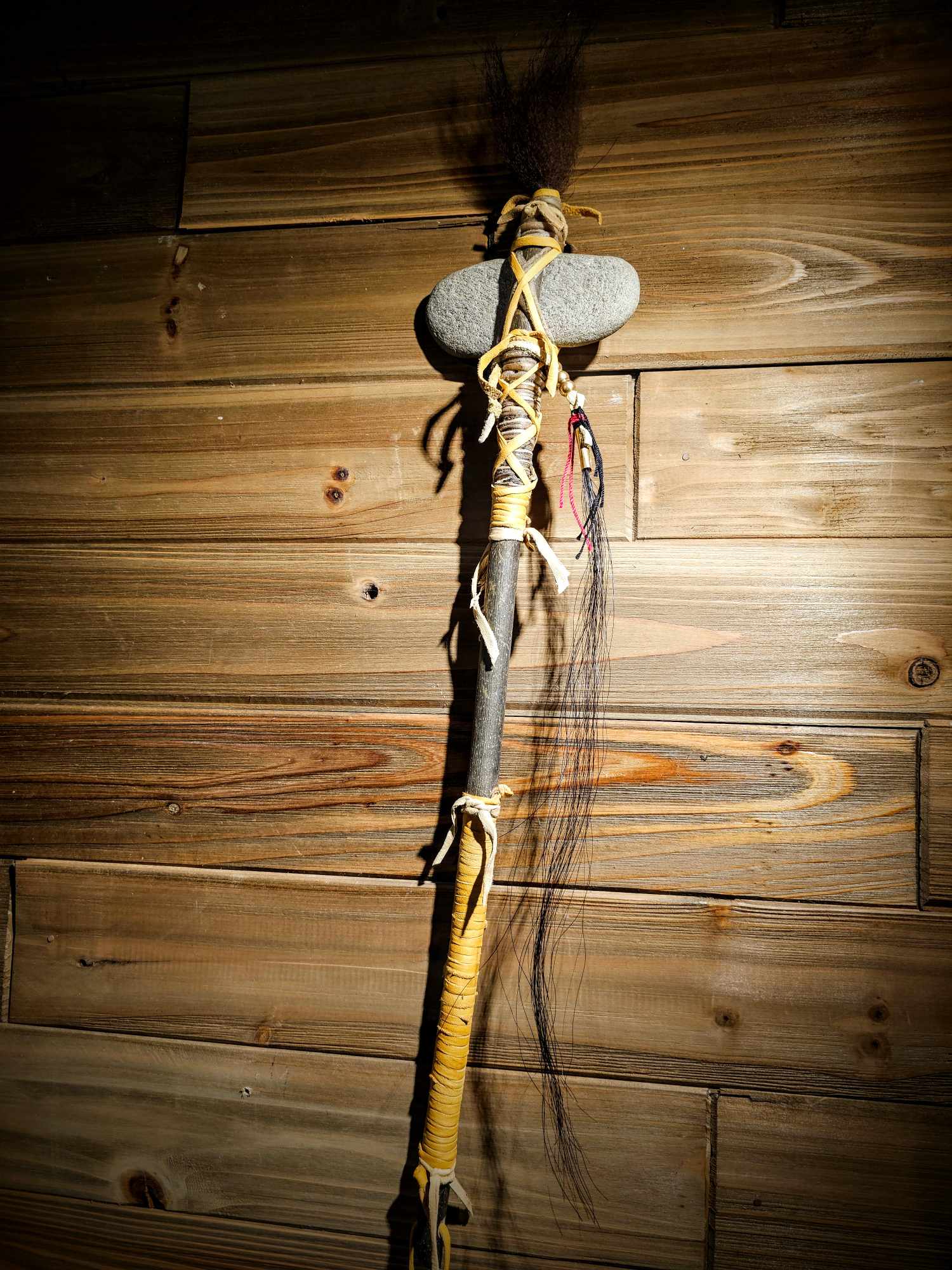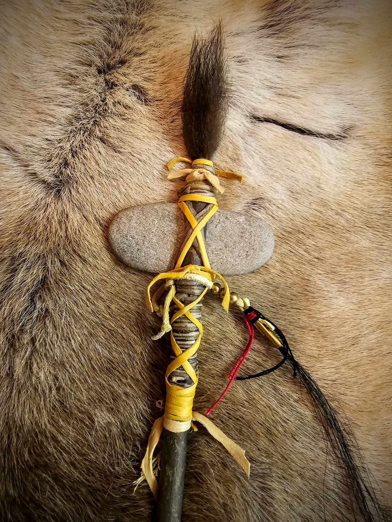 Traditionally Crafted Ceremonial Stone Club - White Ash wood handle, East Prong Roaring River granite, Elk rawhide lace, Bear hair, Horse tail, brass bead and buckskin make up the spirit of this piece. This was a way for me to pay homage to the technology of my American ancestors and tools which paved the way for our more modern efficiencies.