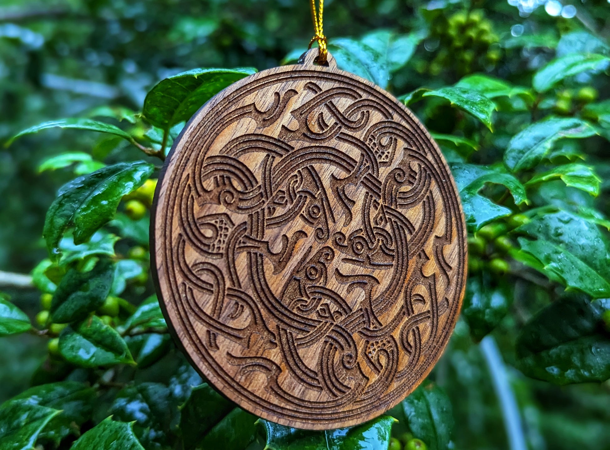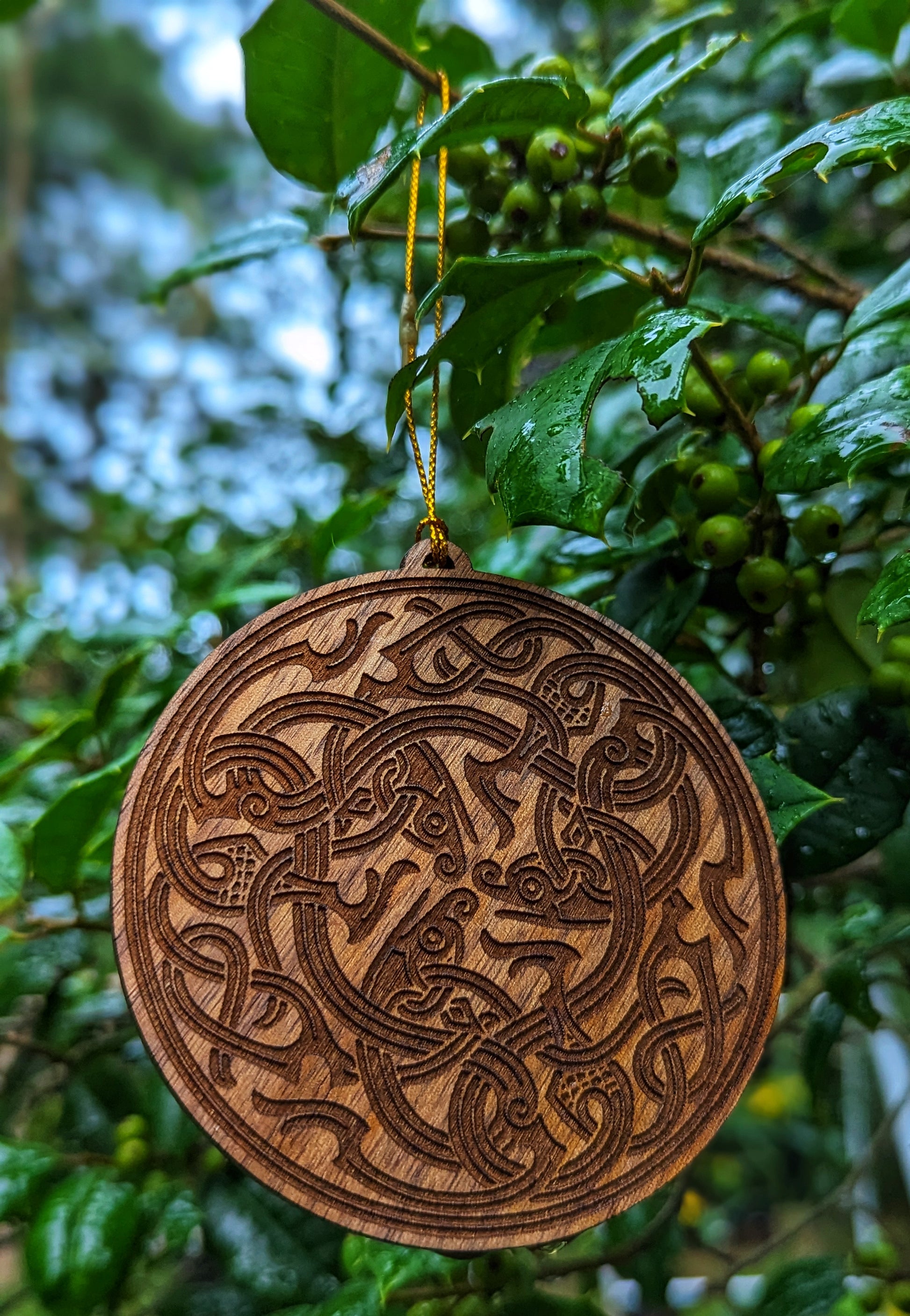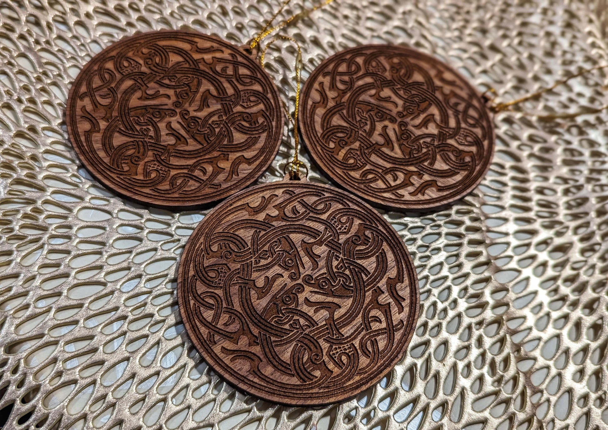 Set of three Nordic knotwork ornaments in the Jelling era style which ranged from the late 9th to late 10th century of Scandinavia. Engraved on beautiful rich walnut wood. Comes with a gold pop on hanger which can be removed in favor of your own wire or hanger.