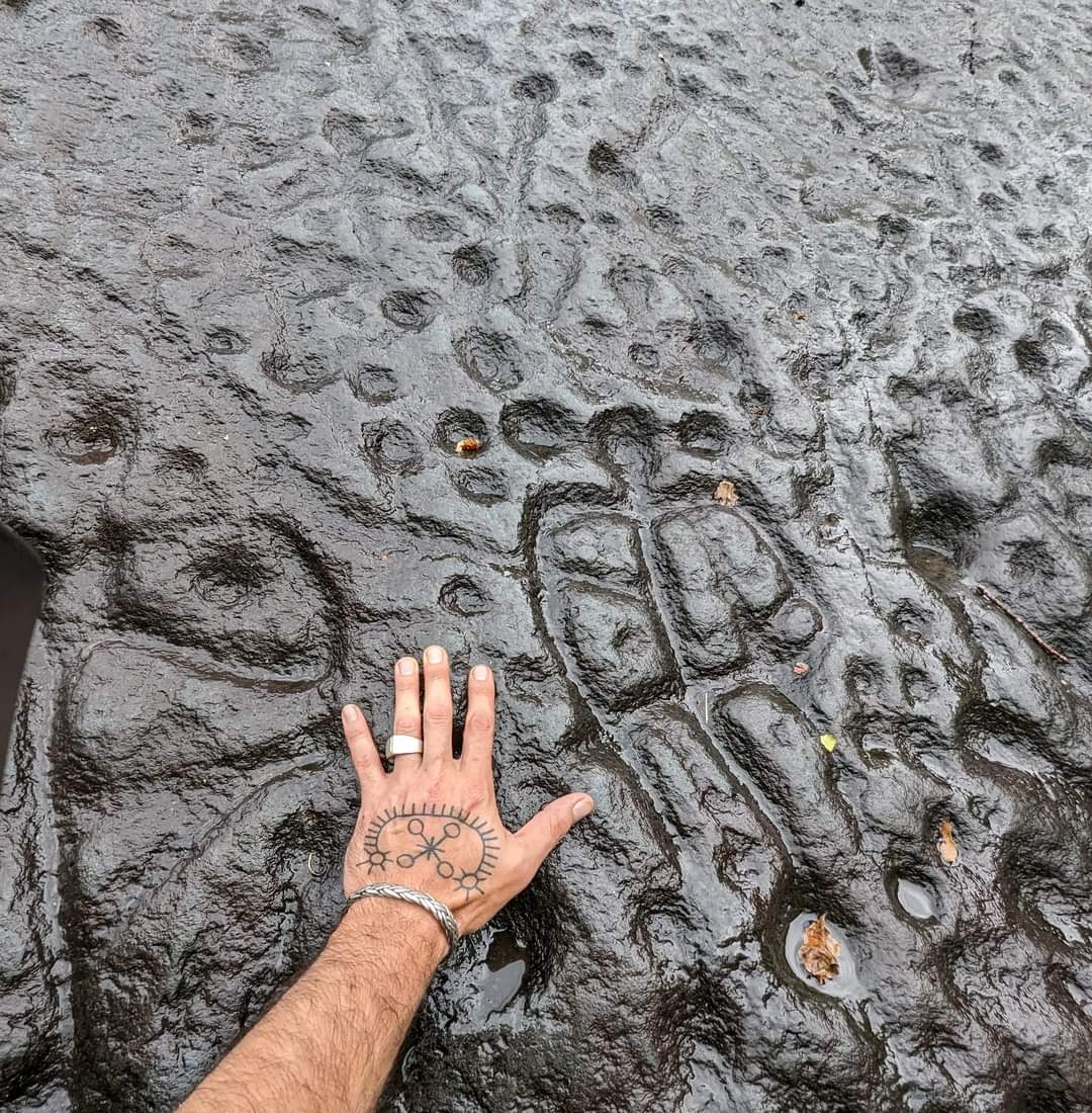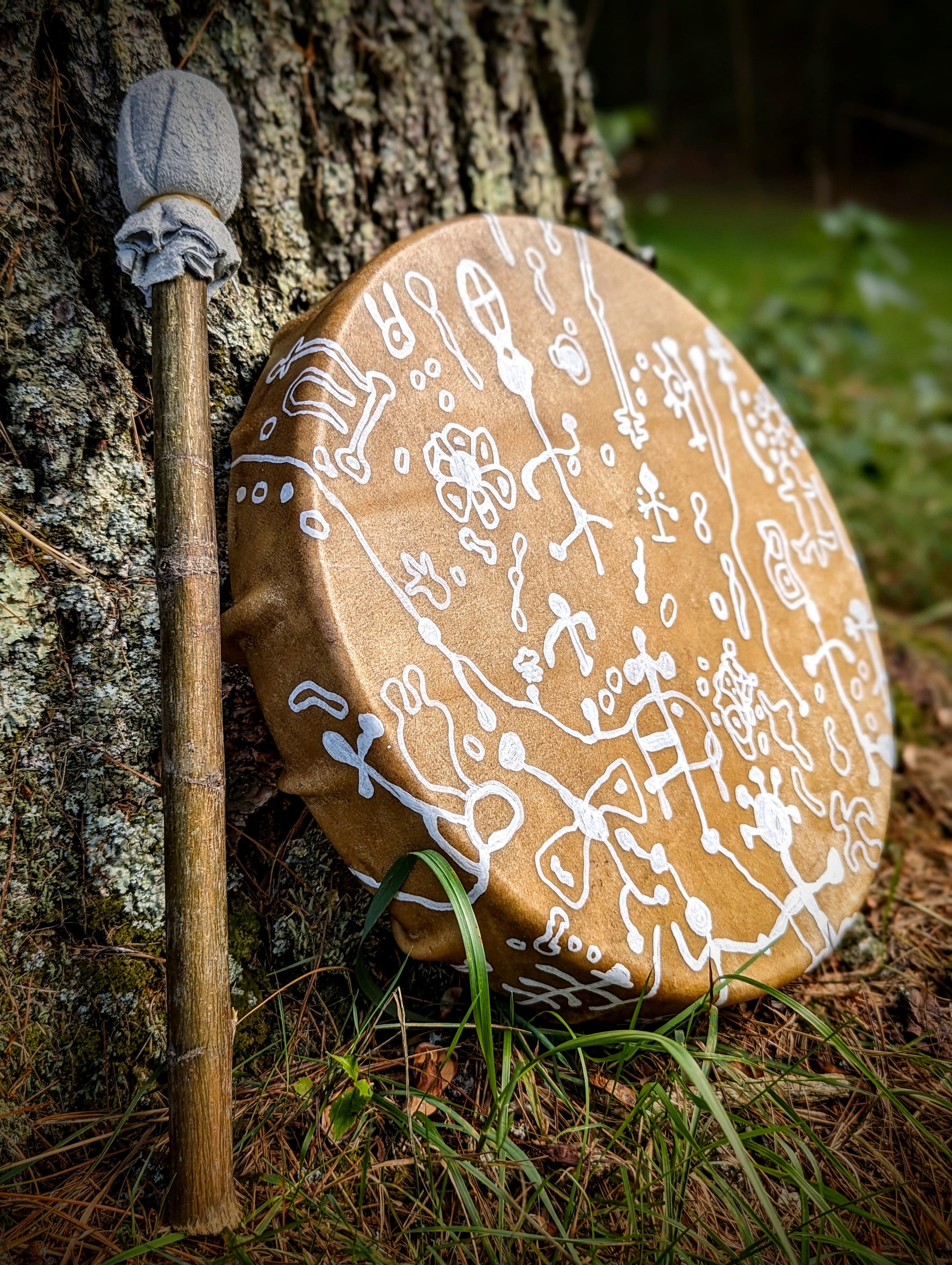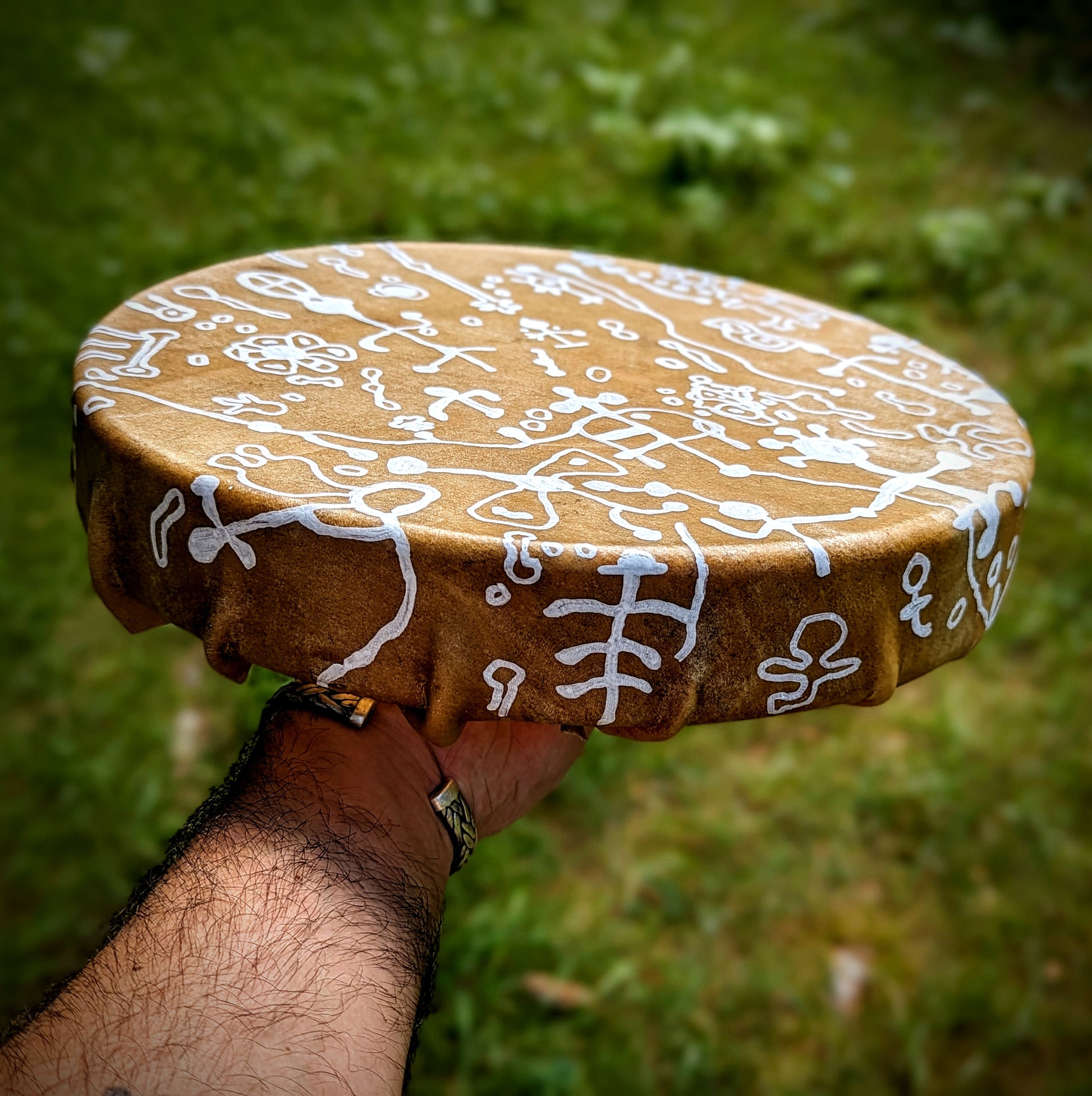 Artwork inspired by Judaculla Rock, featuring 2000+ year old petroglyphs, which I visited last month as a part of a profound spiritual experience. I am sharing a piece of that history and magic on this hand painted 12" Elk skin drum. Comes with pictured beater.