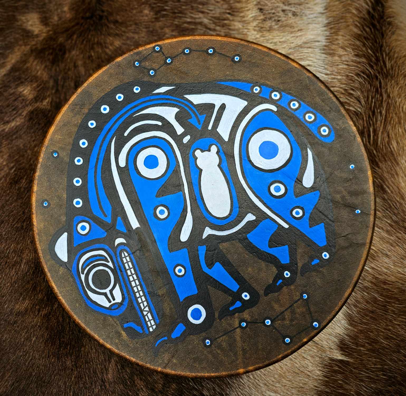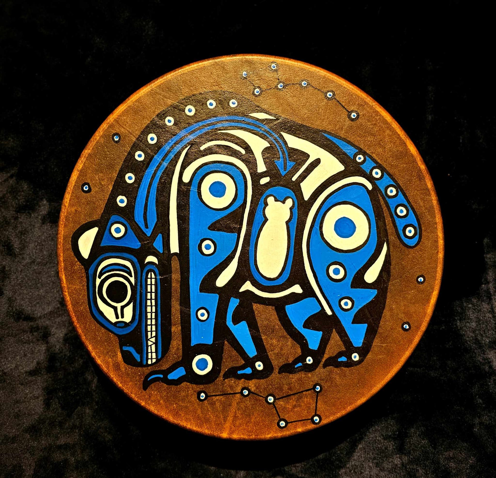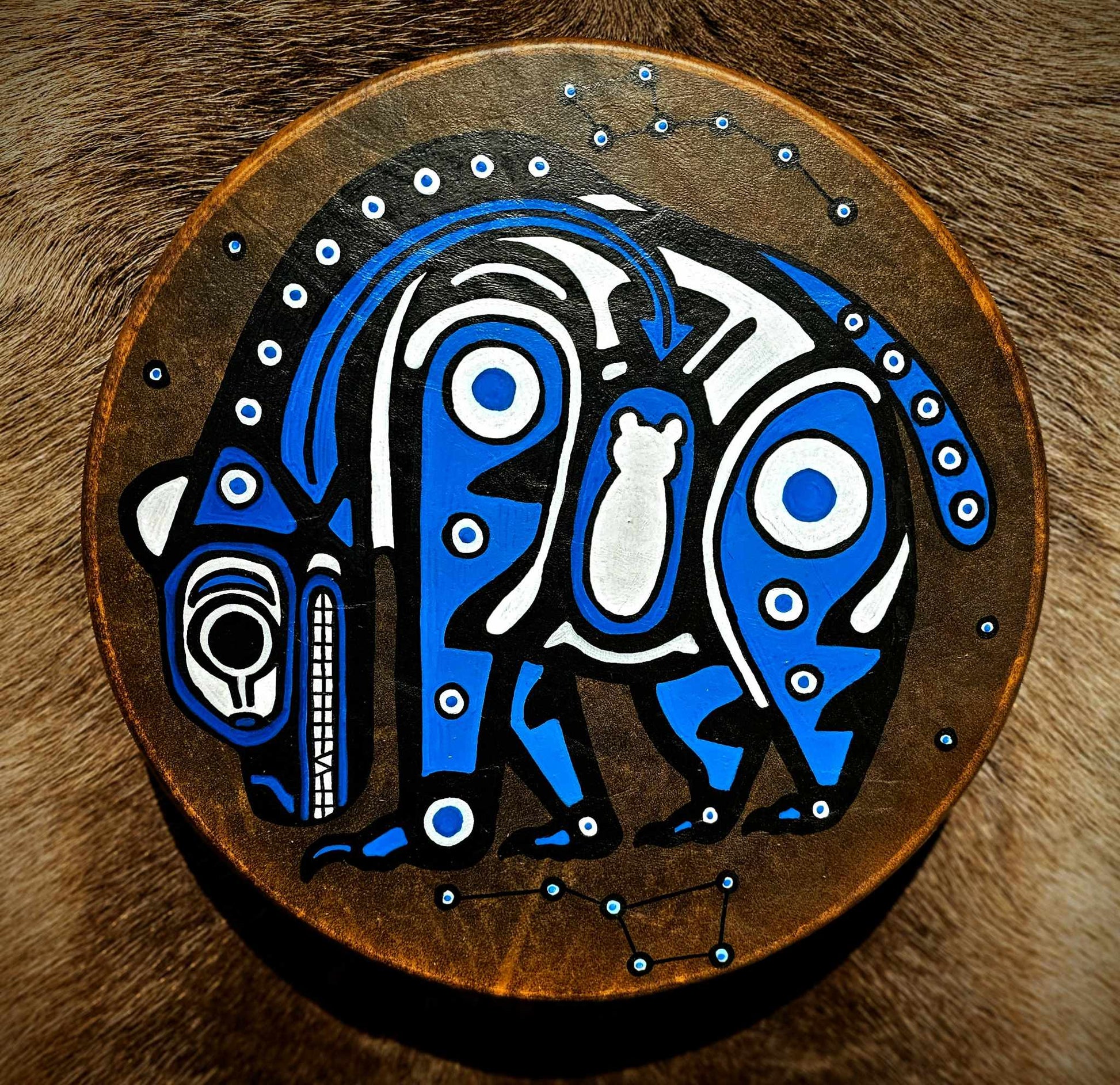 Bear totem drum. Hand painted representing Ursa Major, Ursa Minor Constellations, Horse hide, 15". Deep maple frame.