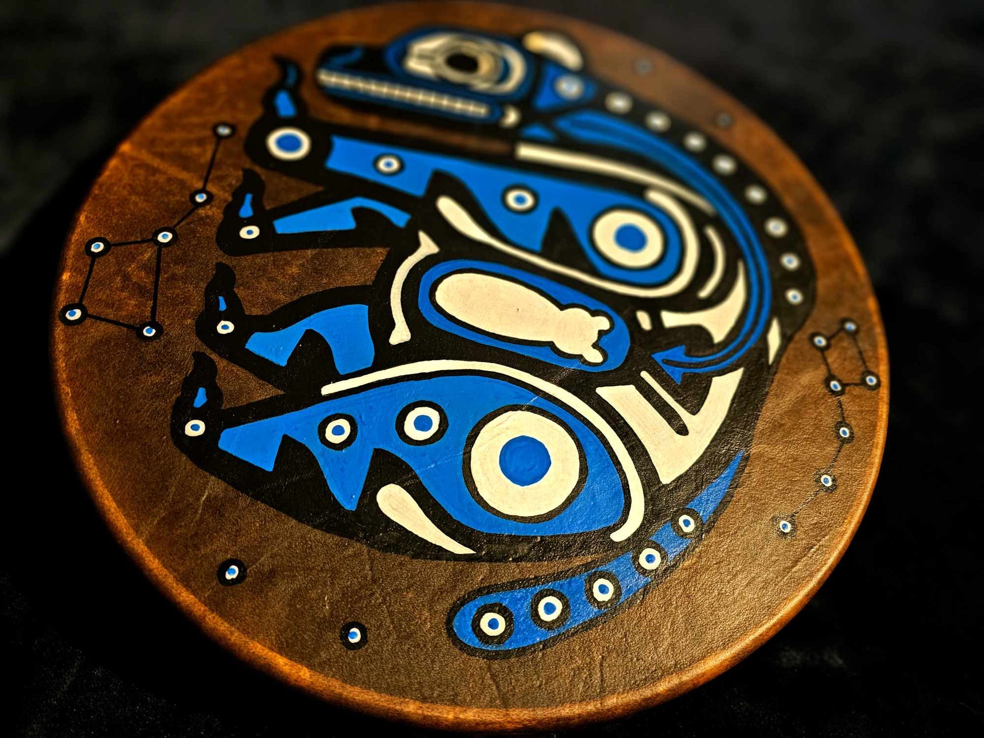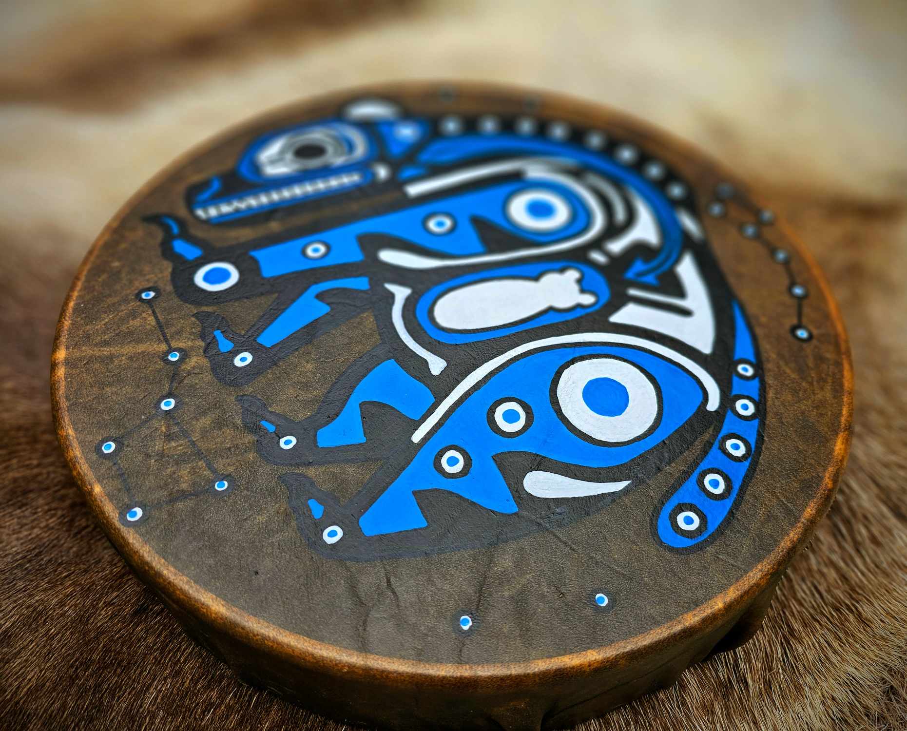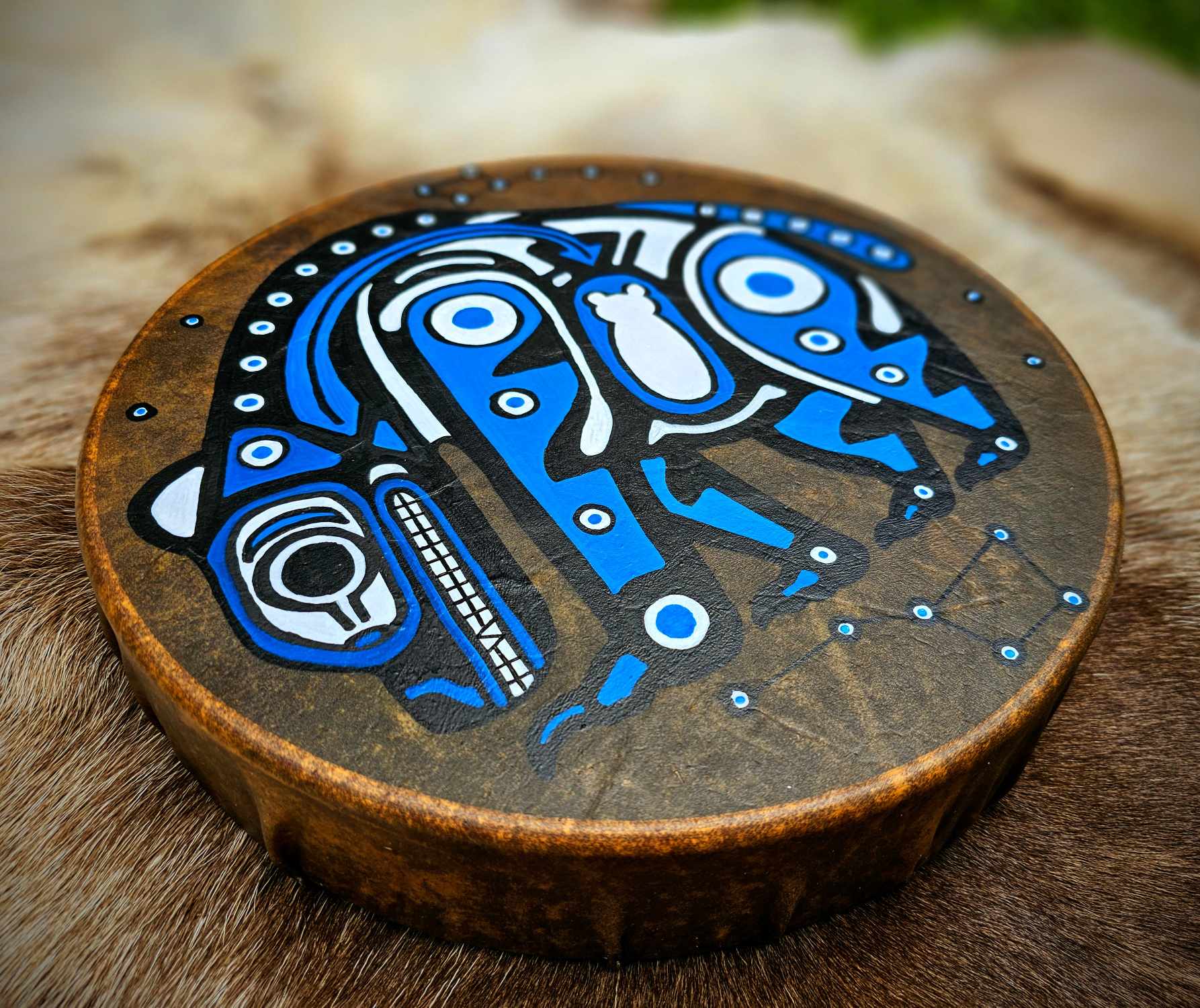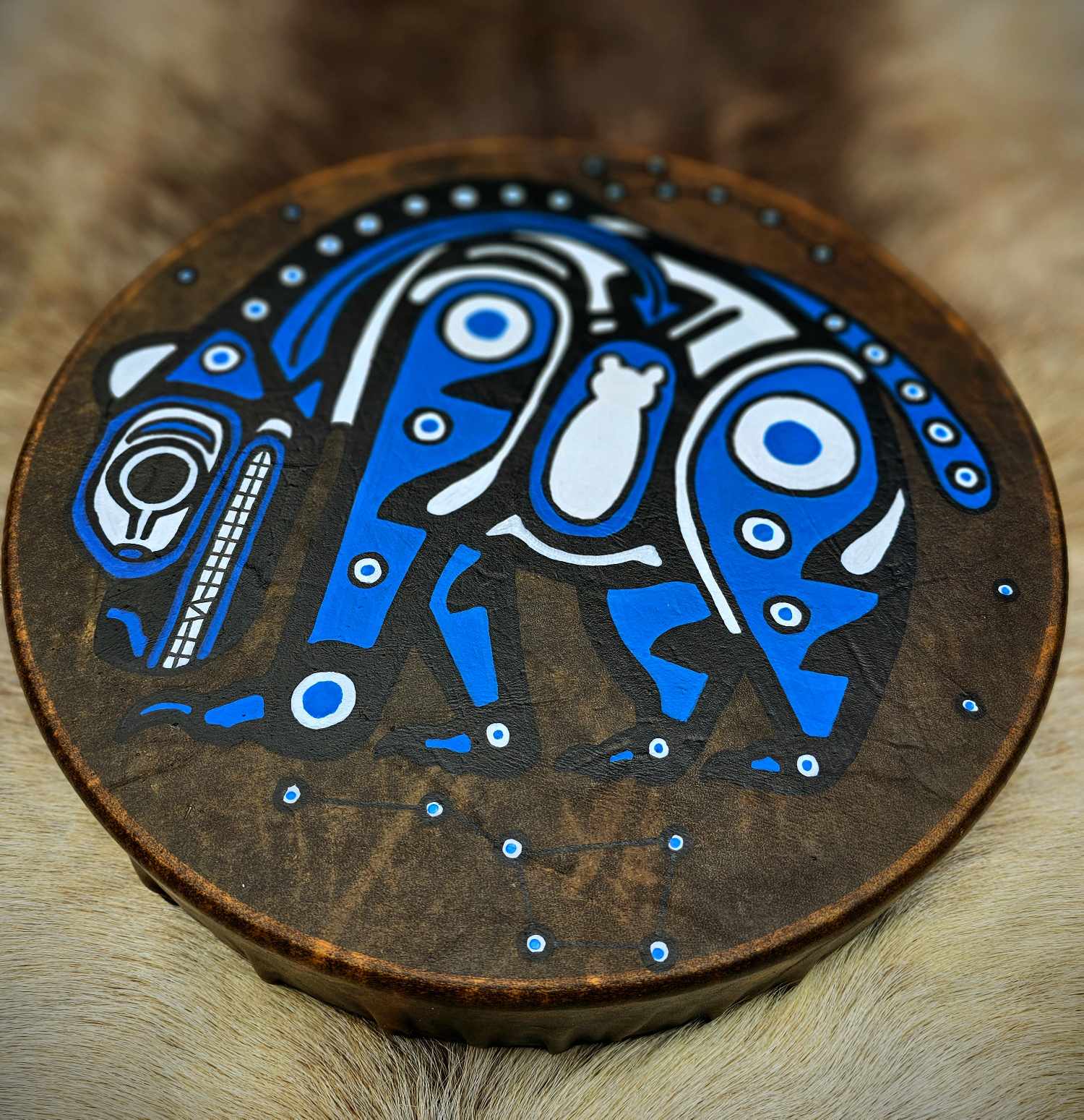 Bear totem drum. Hand painted representing Ursa Major, Ursa Minor Constellations, Horse hide, 15". Deep maple frame.