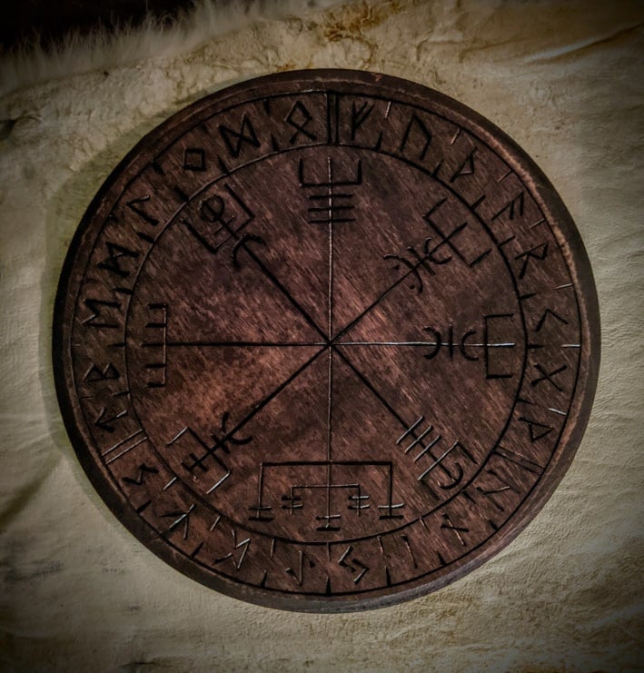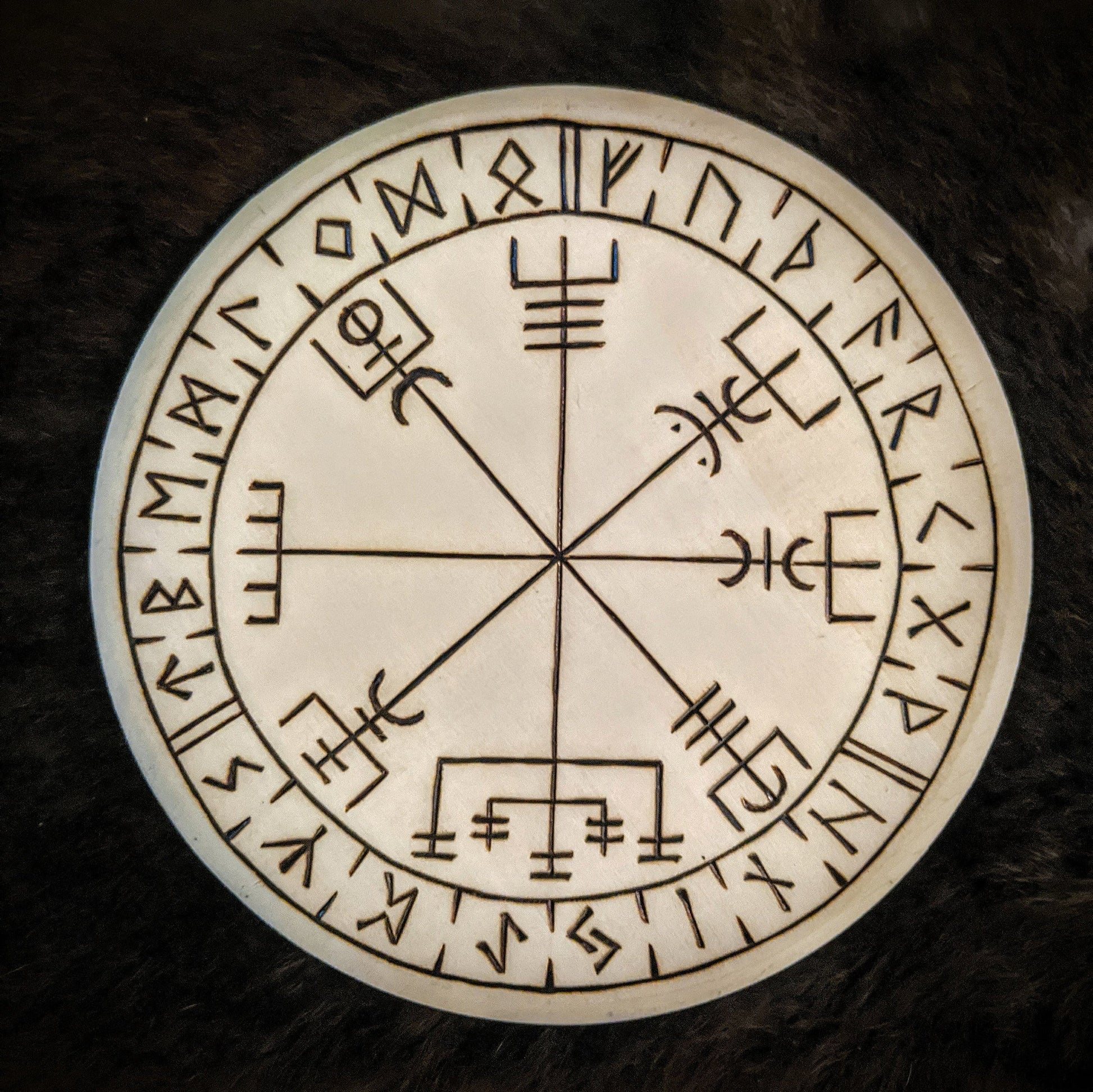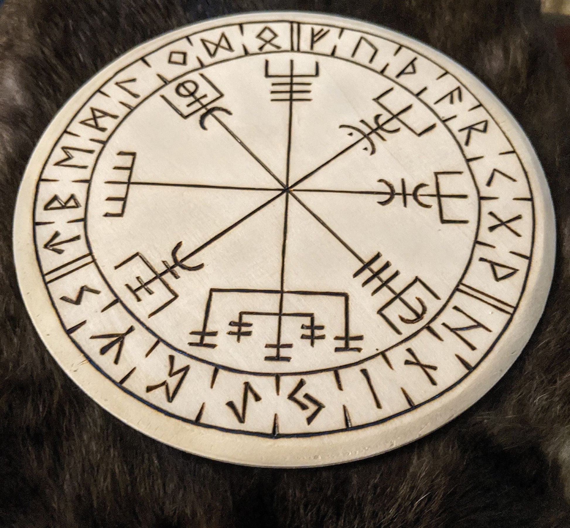 Burned wood altar plate, featuring Vegvisir encircled by the Elder Futhark runic alphabet.