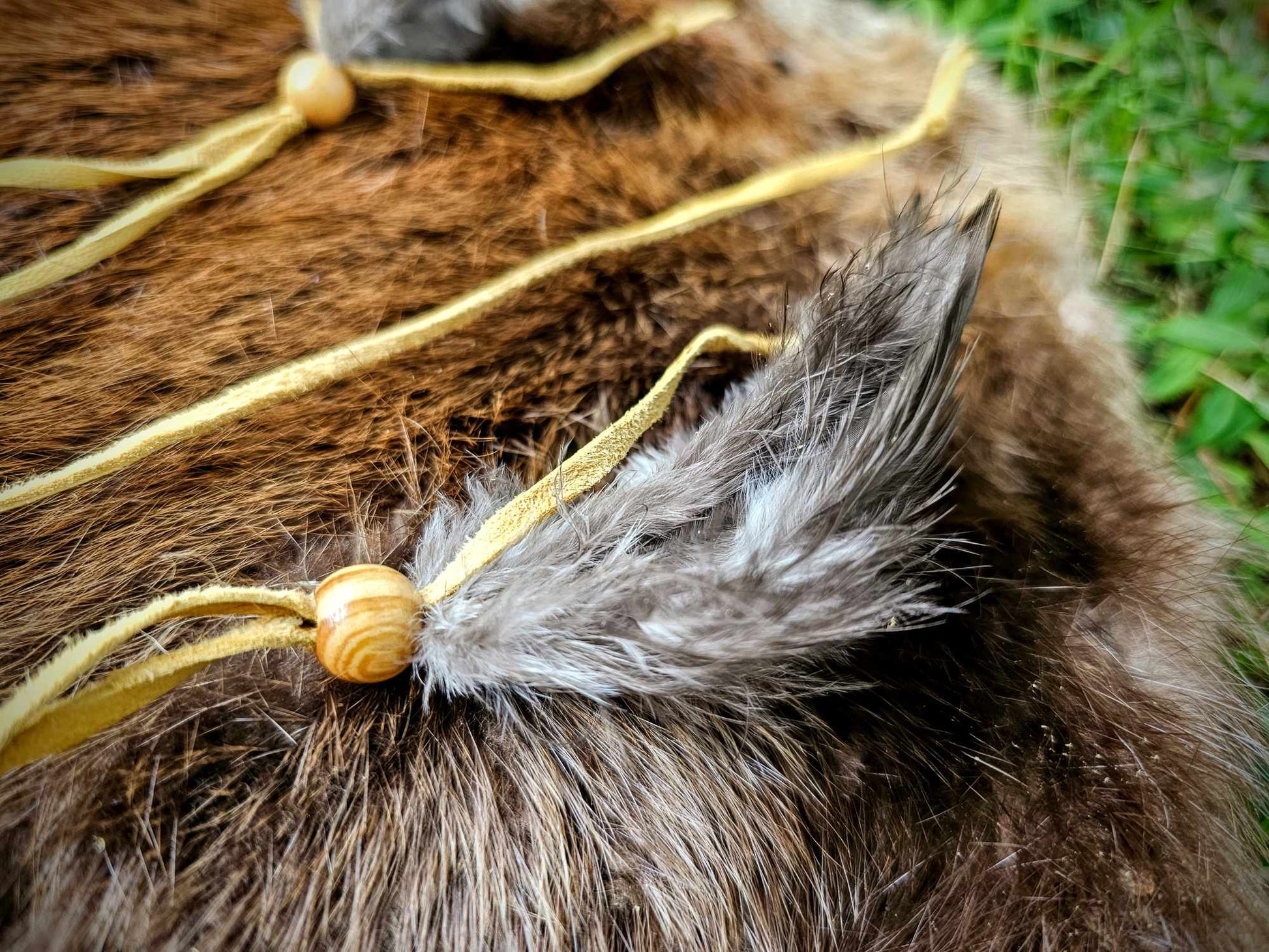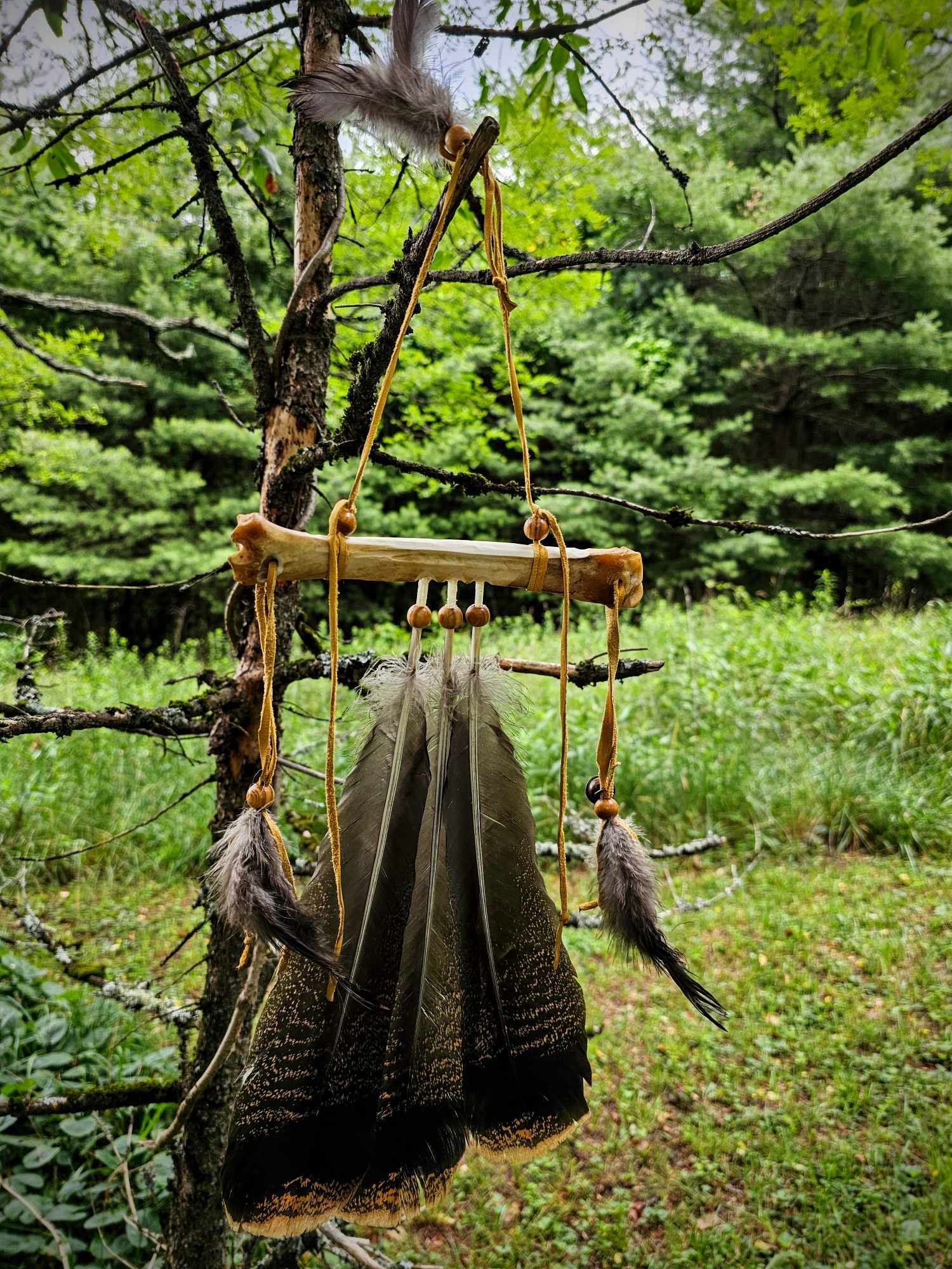 Blessing smudge fan with Deer bone, Turkey feather, Hawks bell, Olive wood bead and buckskin. Deer and Turkey as animal totems are commonly known to represent blessing, abundance and prosperity, bells are utilized in spirit work around the world to chase away negative spirit and energy so these all felt most fitting for this type of tool.