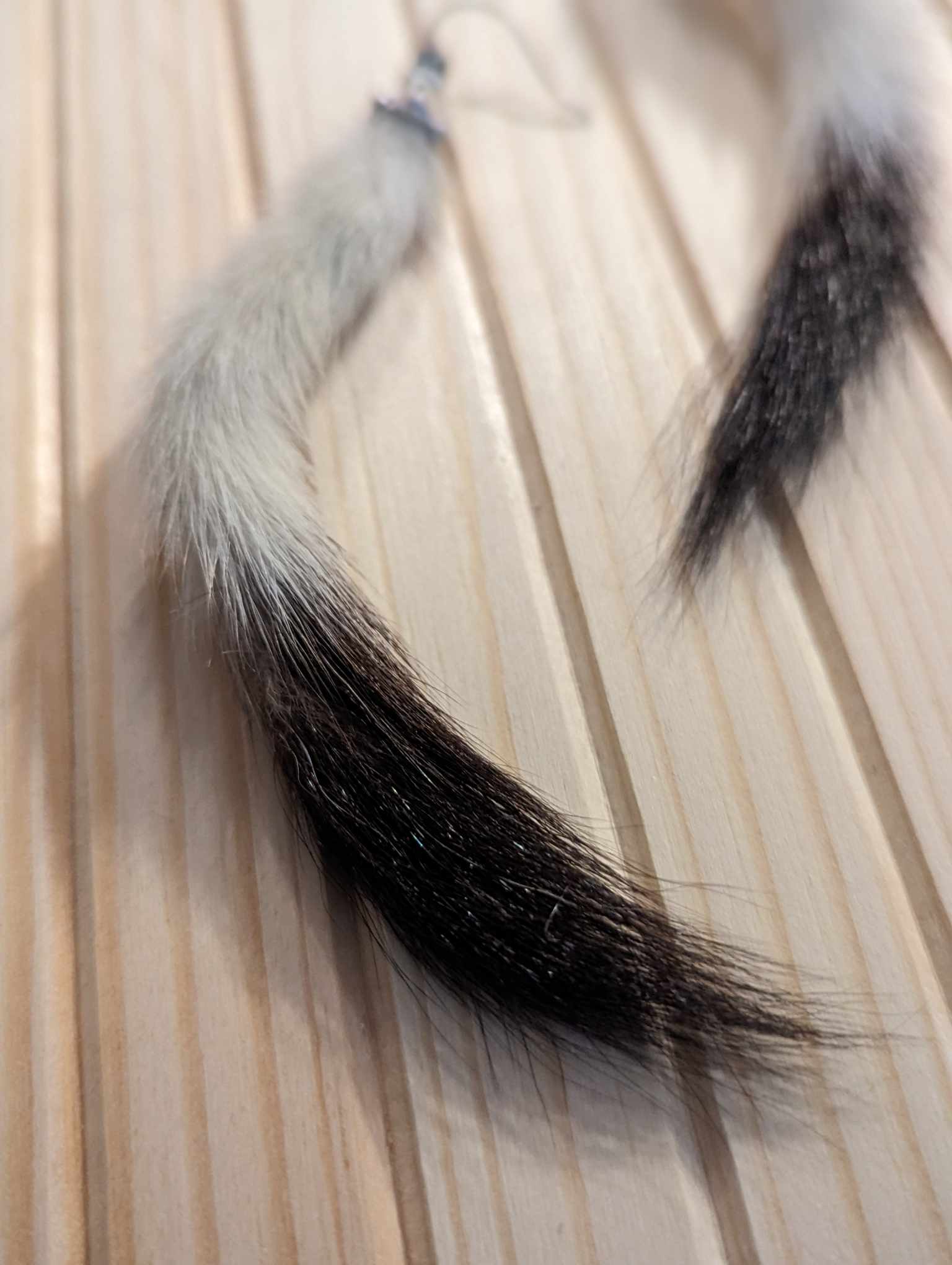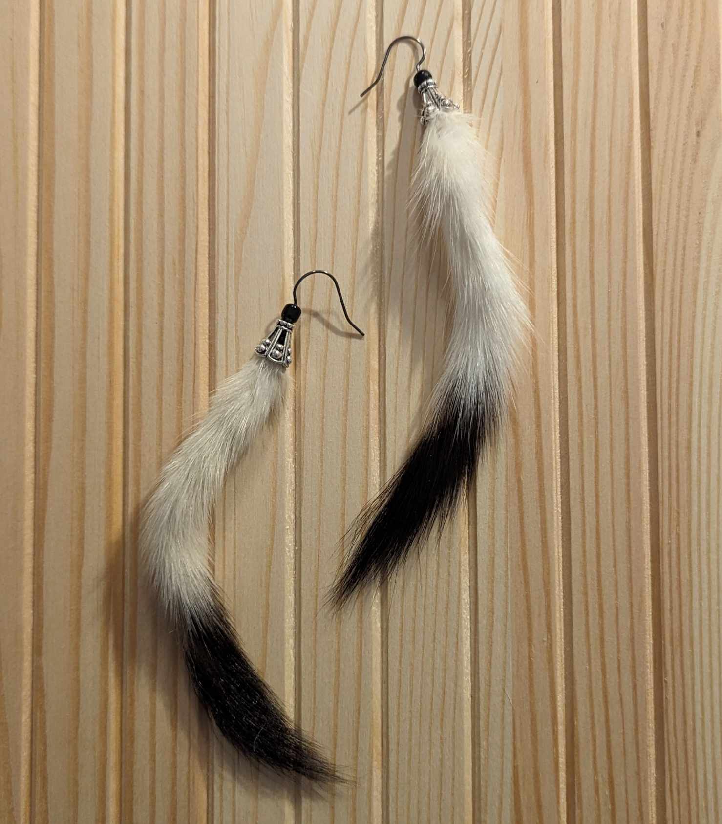 Approximately 4 inch long natural winter coat ermine tail earrings with black glass beads. Lightweight. Nickel free metal hardware.