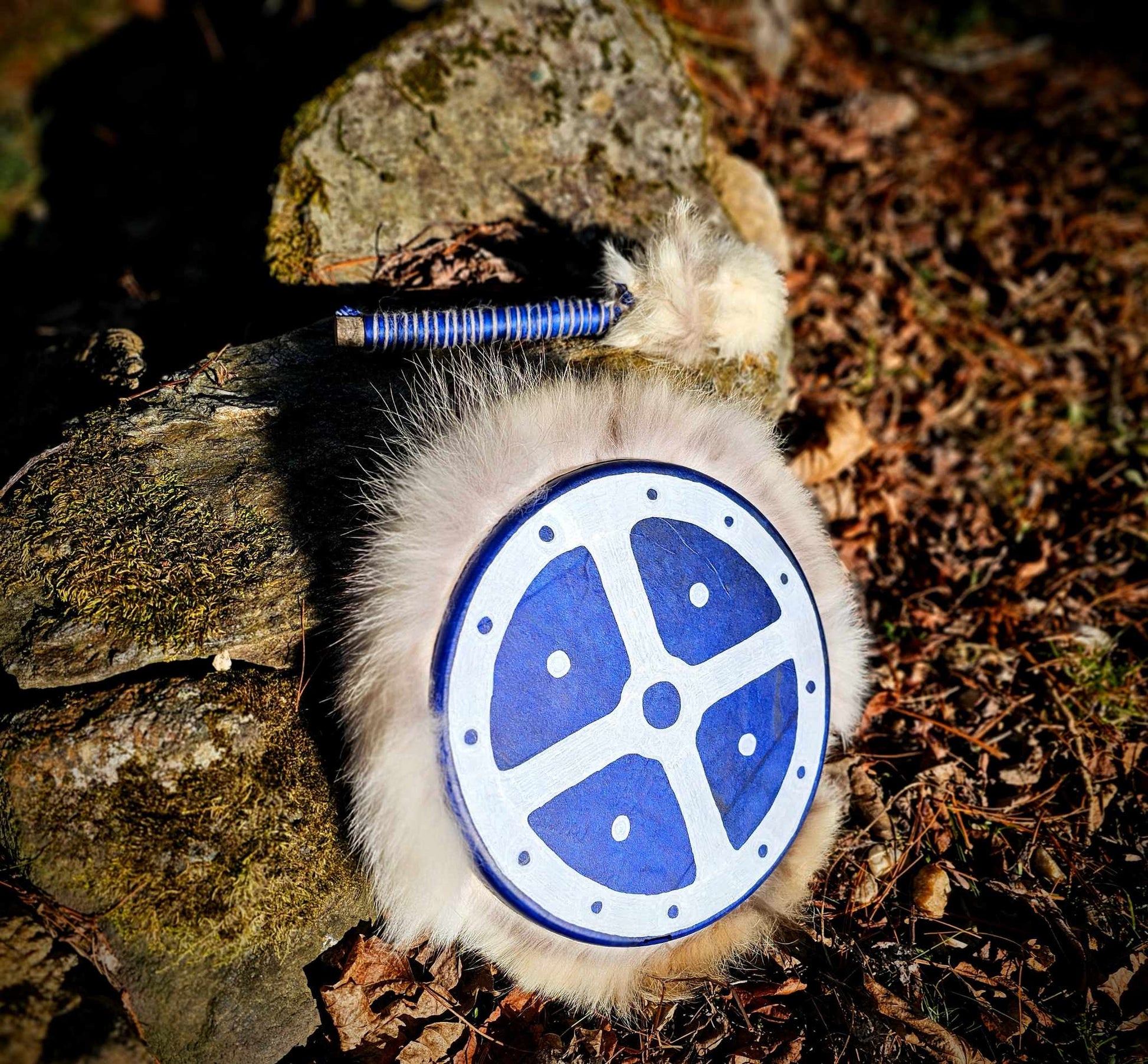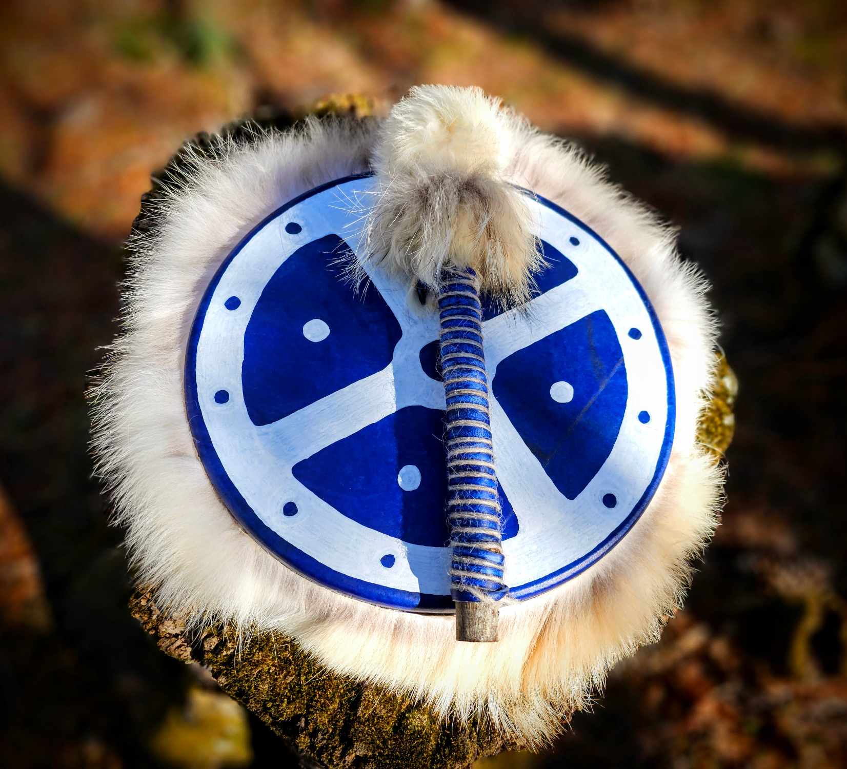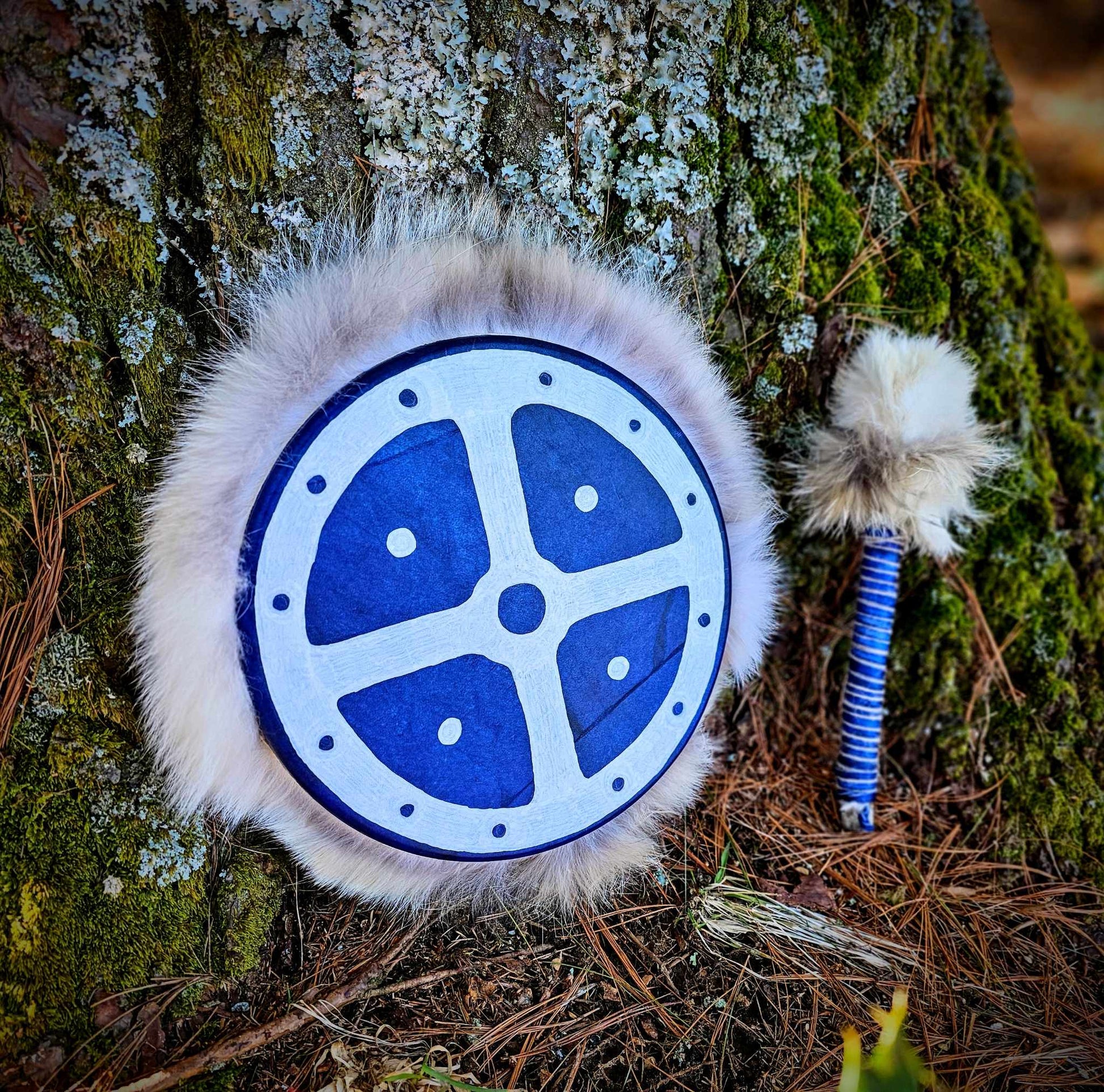 10" Blue dyed Deer skin drum with painted Sunwheel and Coyote fur wrap. Rawhide hand hold and drumstick wrapped with Icelandic sheep wool, Alder branch drumstick head is fleece, covered with White Rabbit and Coyote.