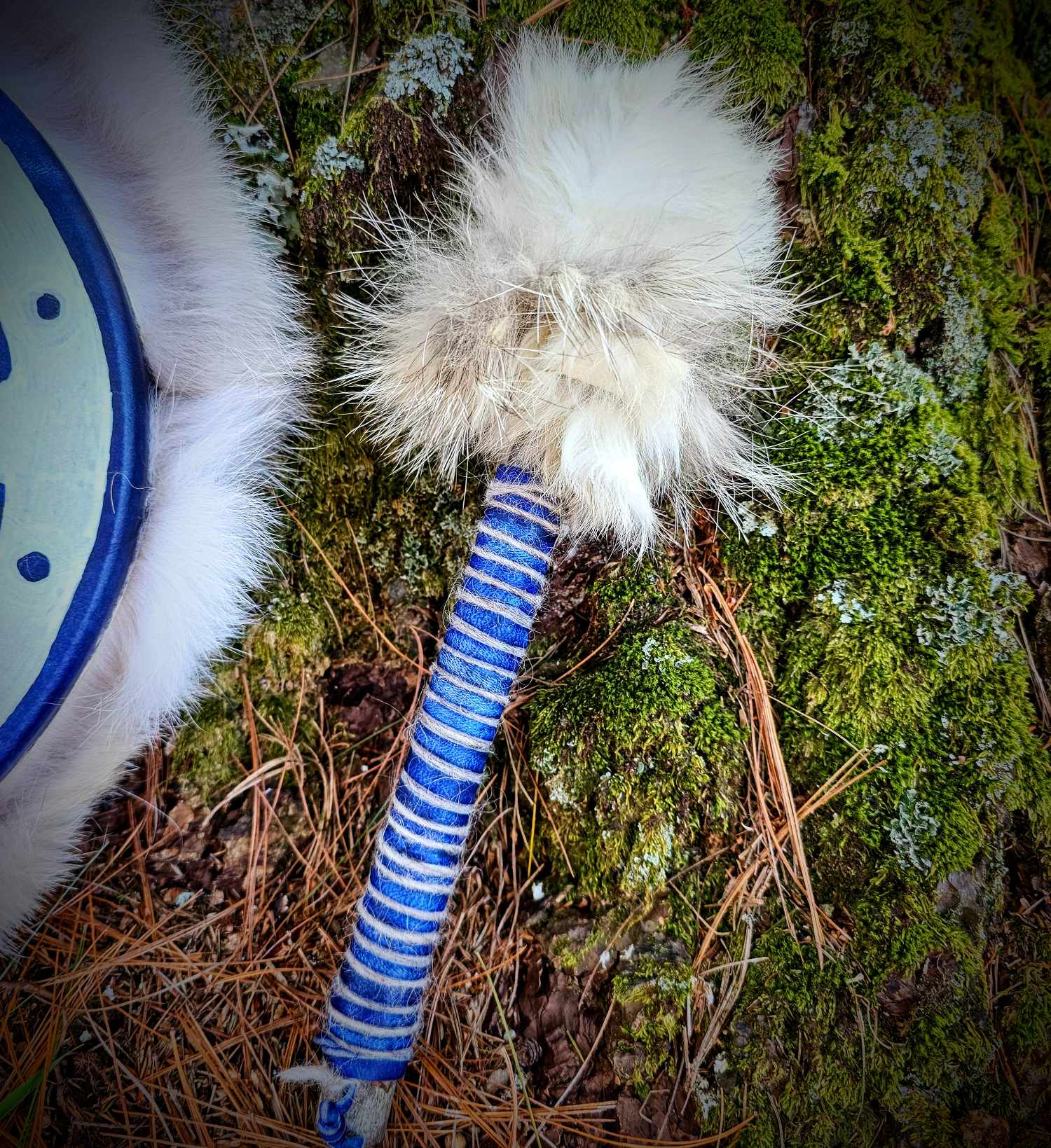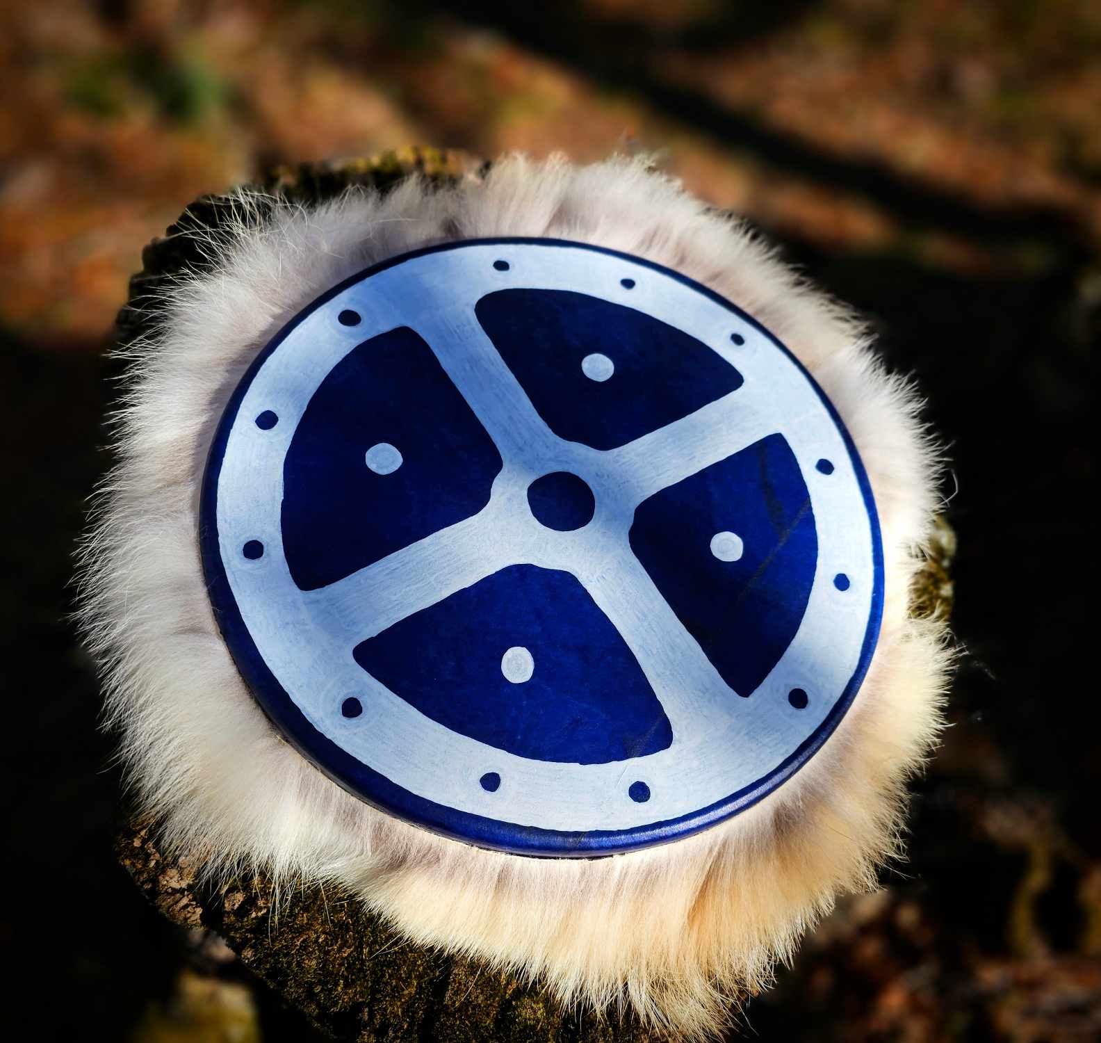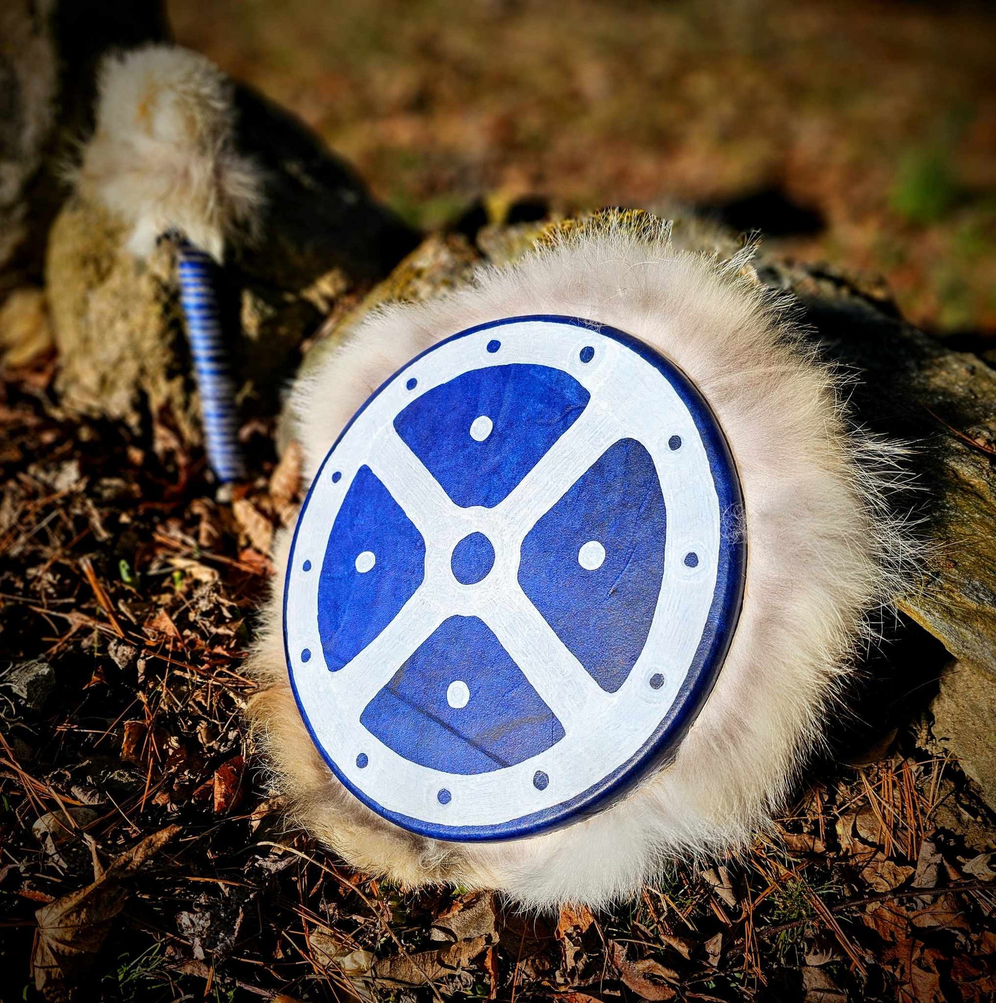 10" Blue dyed Deer skin drum with painted Sunwheel and Coyote fur wrap. Rawhide hand hold and drumstick wrapped with Icelandic sheep wool, Alder branch drumstick head is fleece, covered with White Rabbit and Coyote.