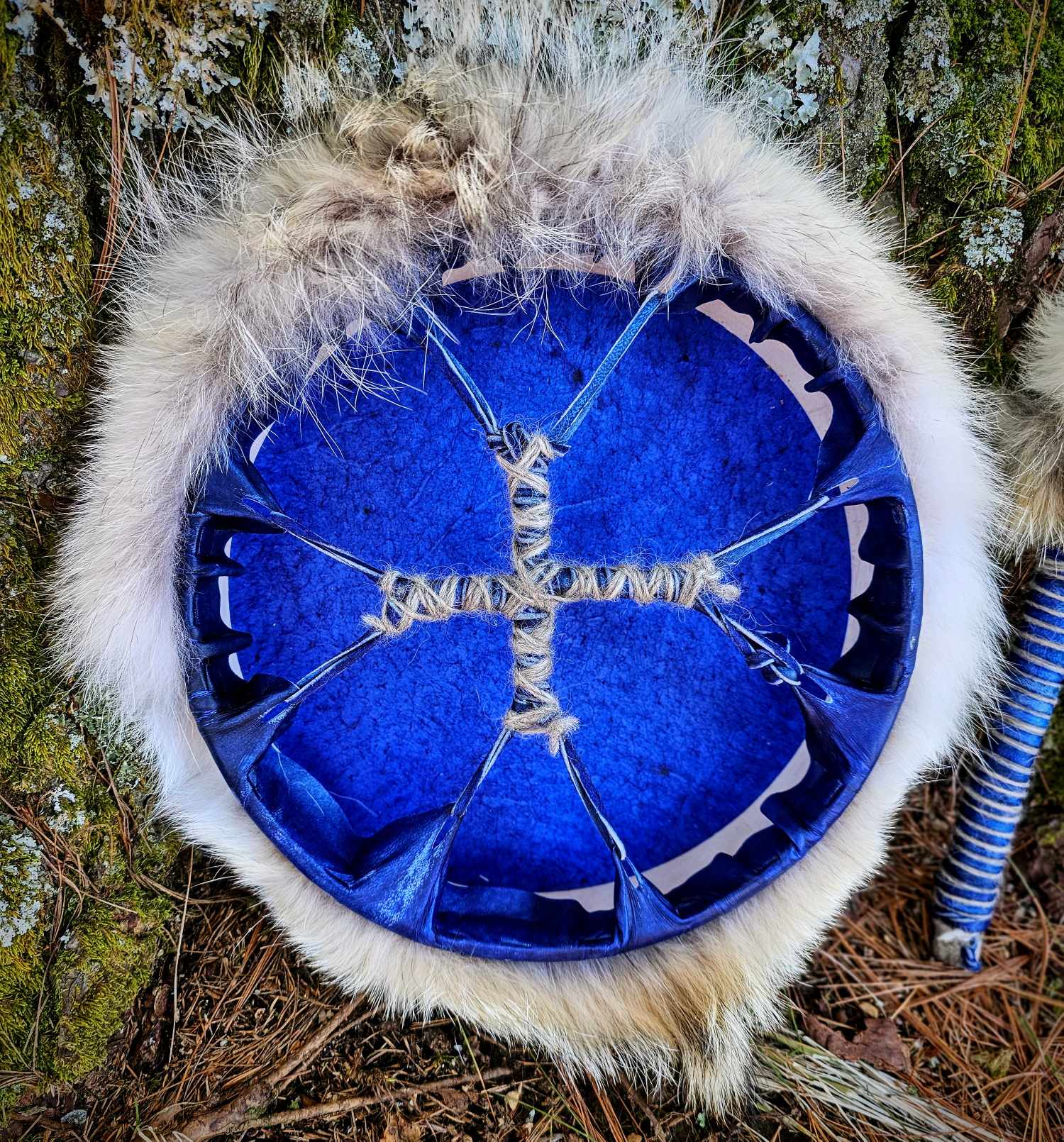 Winter Sundog Blue Deer Hide Drum With Coyote Fur and Rabbit Fur Beater