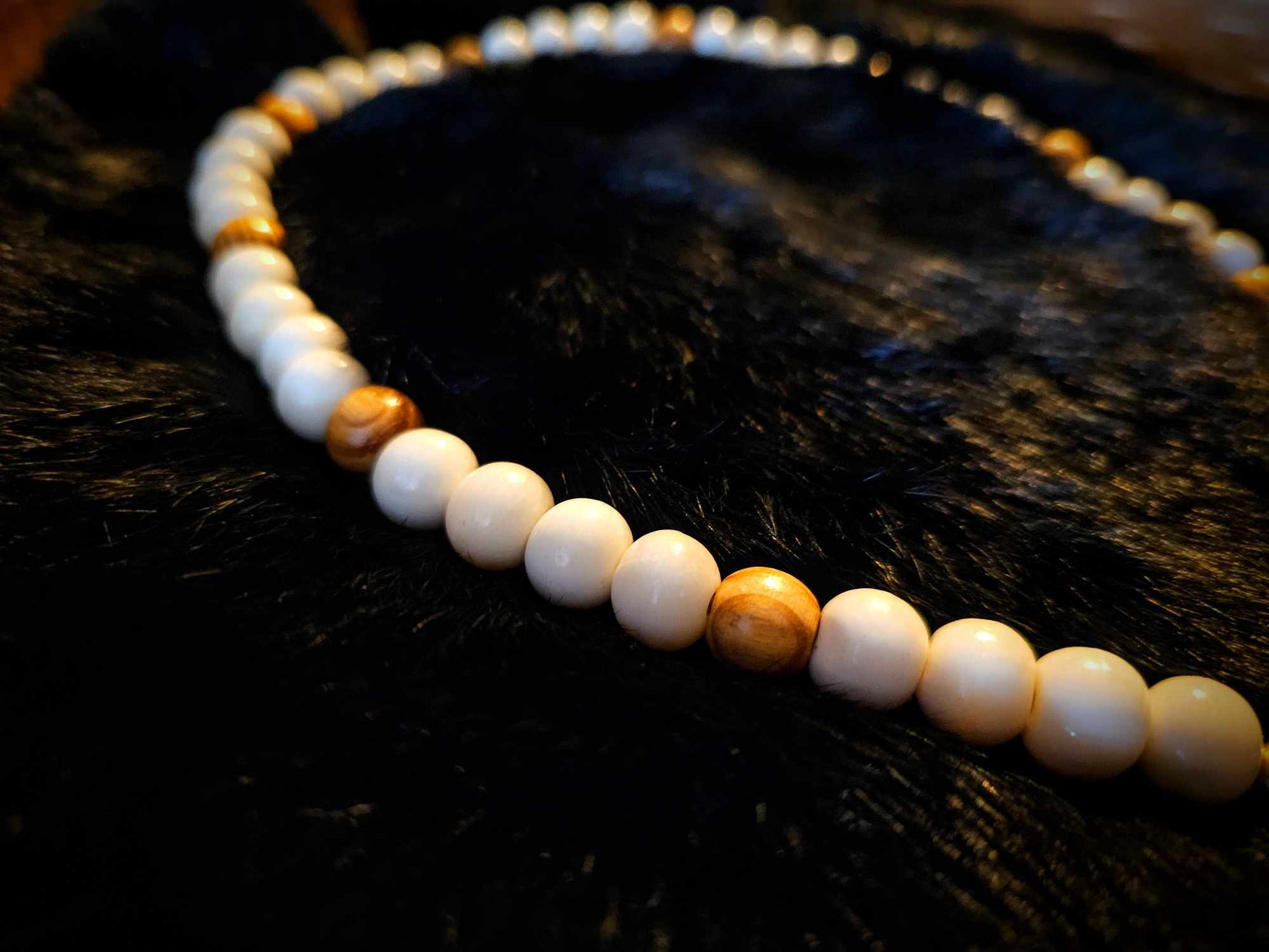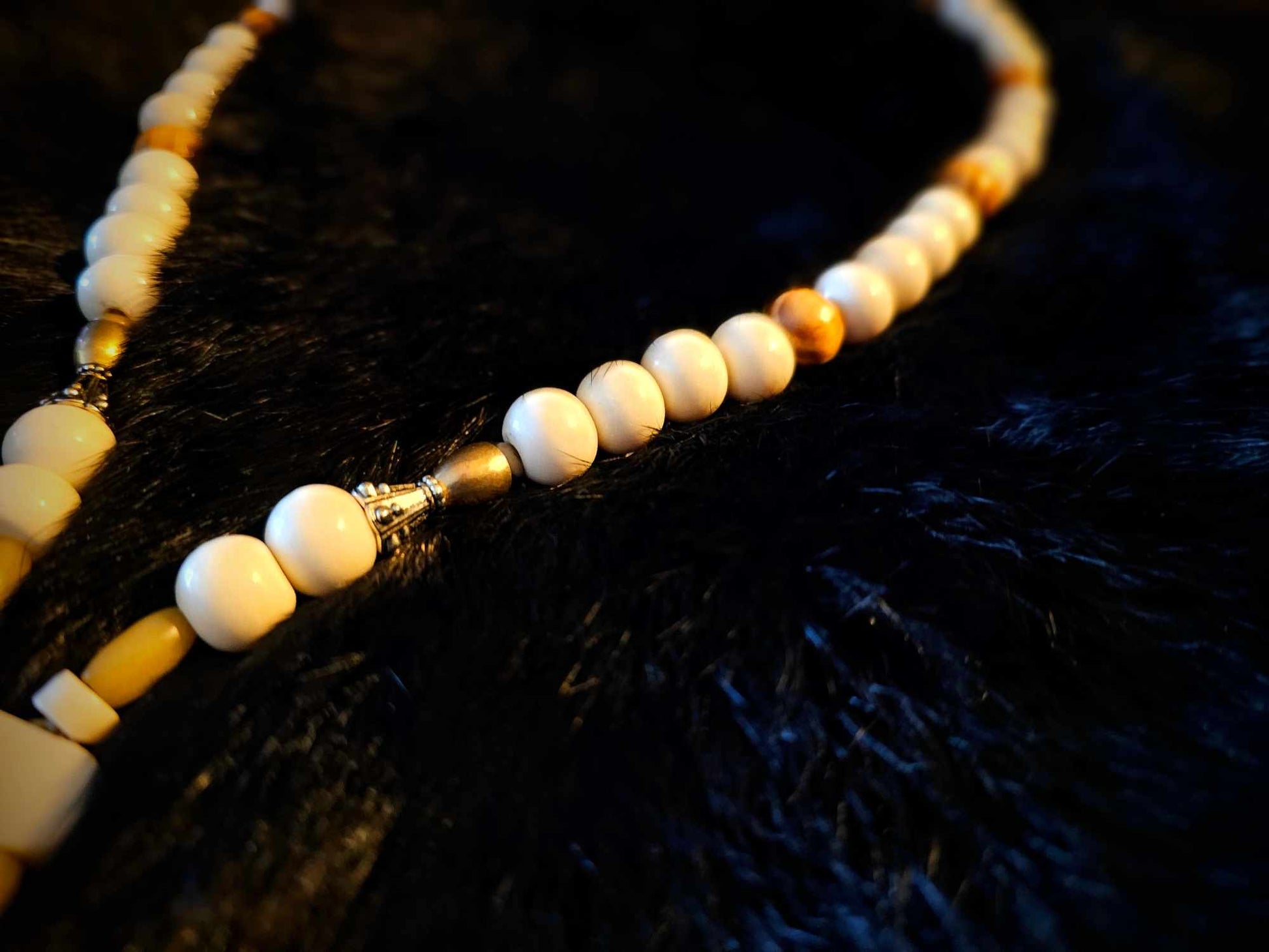 This necklace features unique wild sourced materials, including cow bone, bison bone, wood and brass + metal beads, along with wolf fur. Handcrafted in the heart of nature.