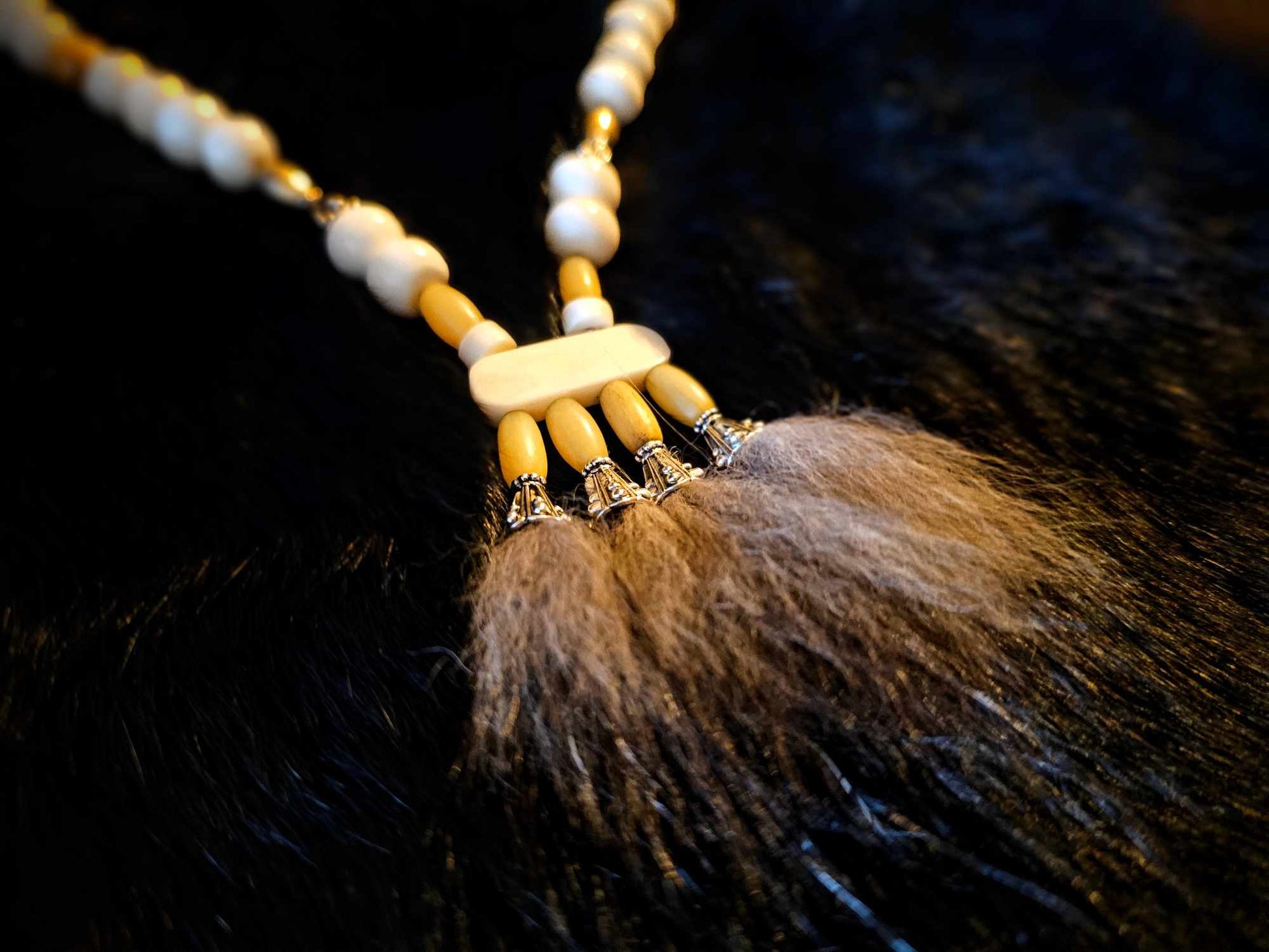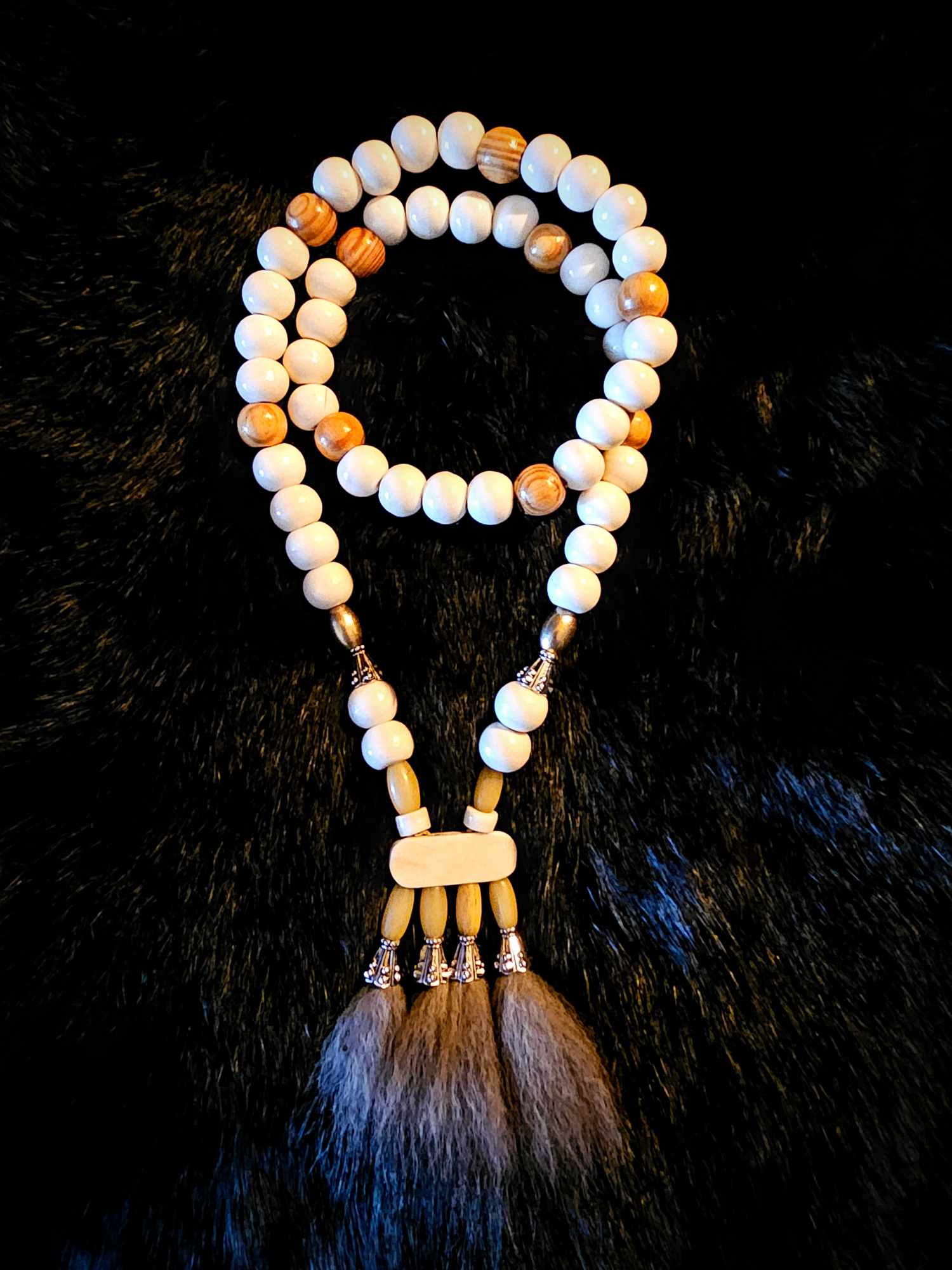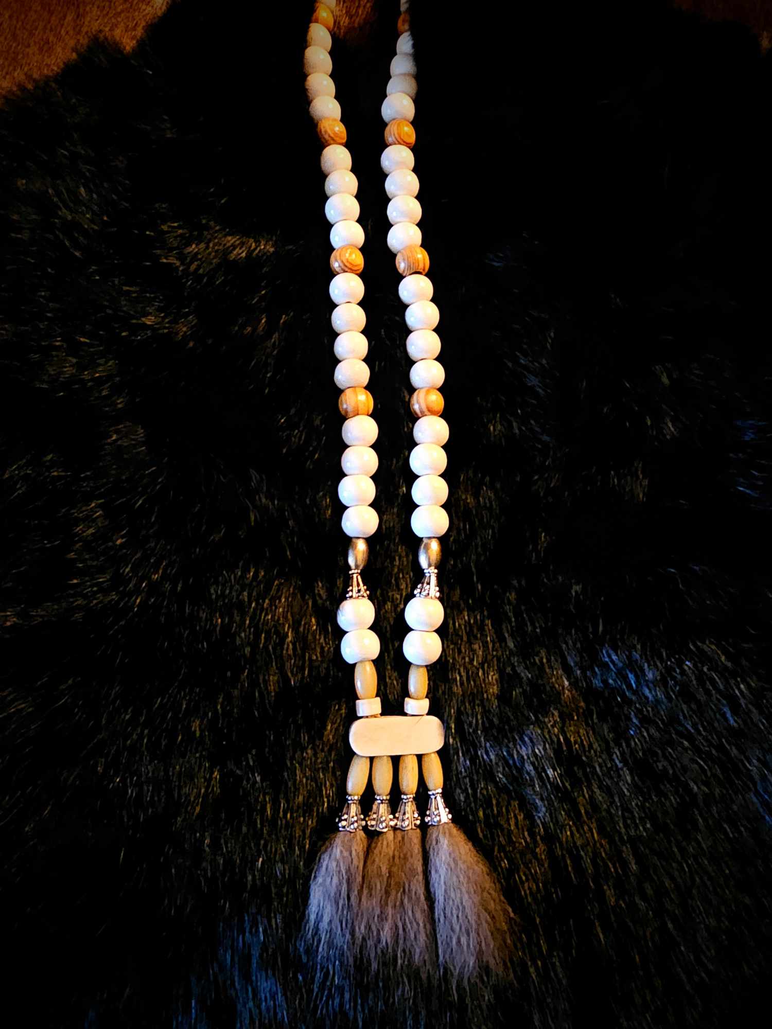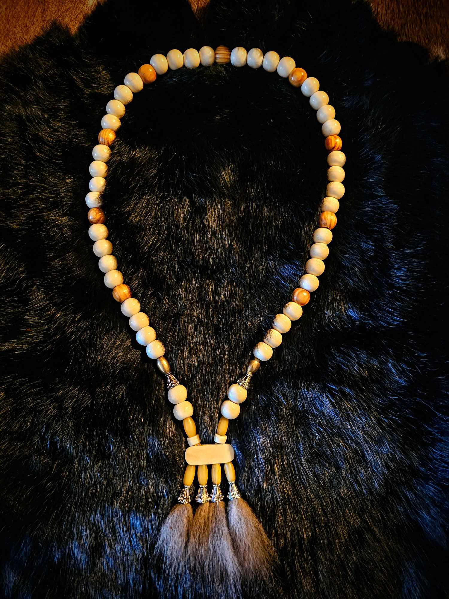 Wolf Fur Pendant with Bison, Cow, Wood, and Metal Beads