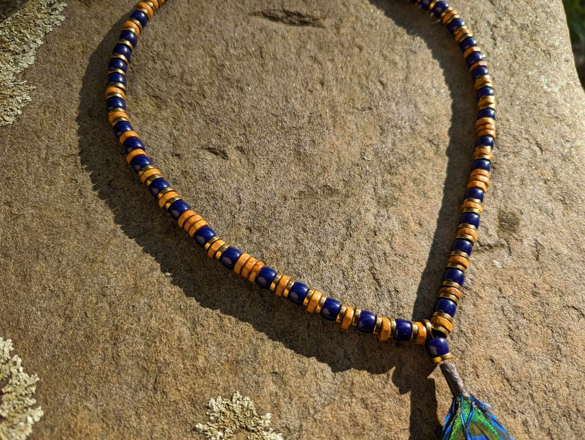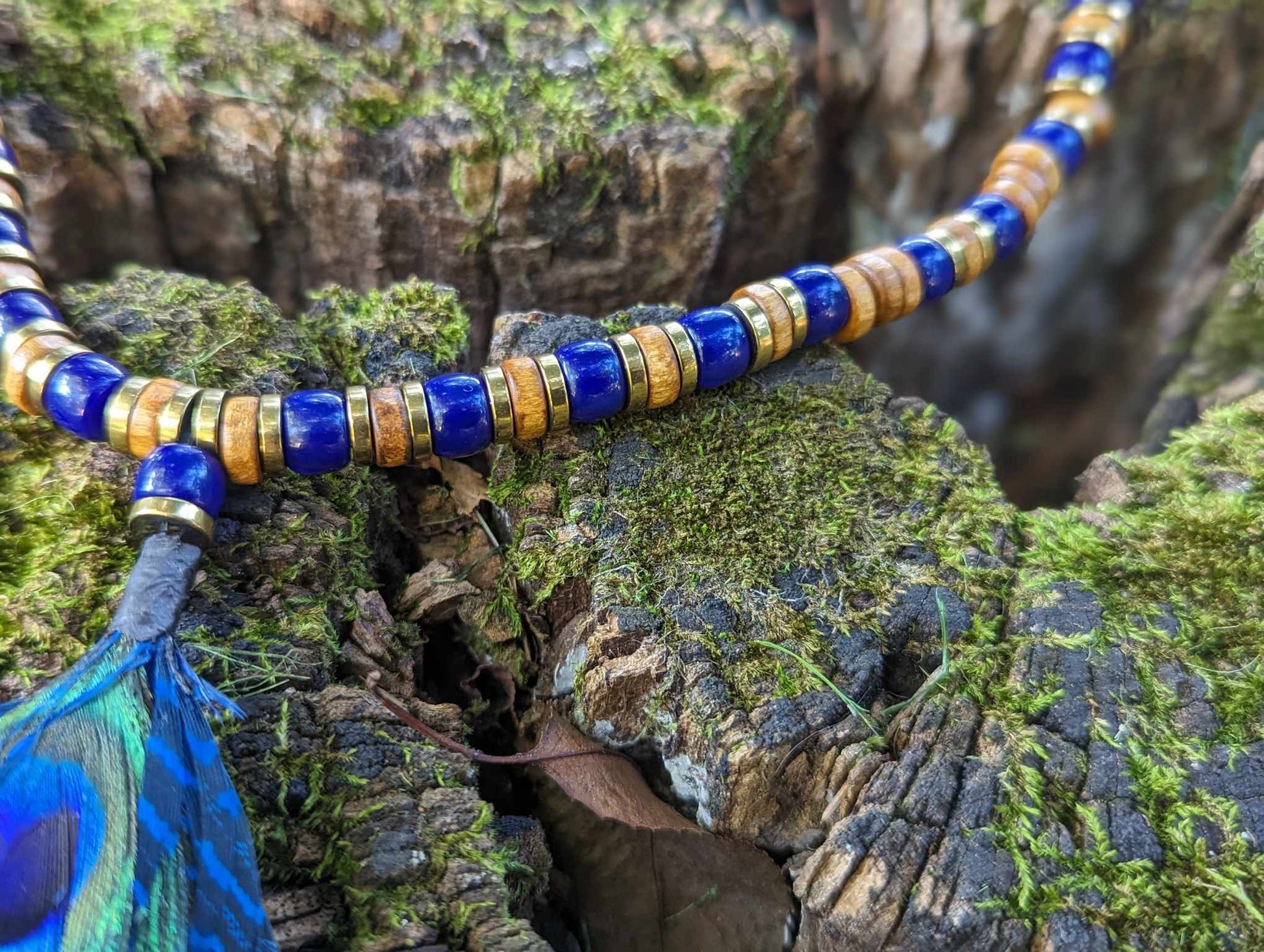 Handmade wood, glass, and metal beaded necklace featuring peacock feather adornment. The cobalt blue glass provides a subtle contrast to the warm tones of the metal and wood for a striking look provided by nature. Slips over head without closure.