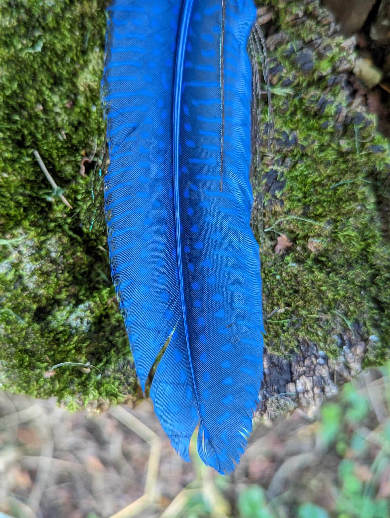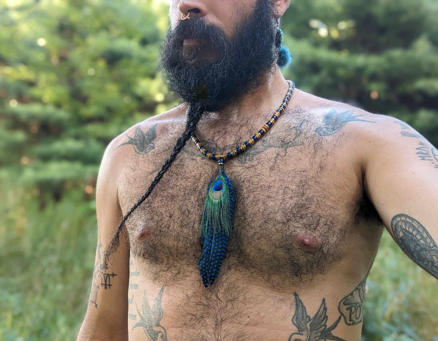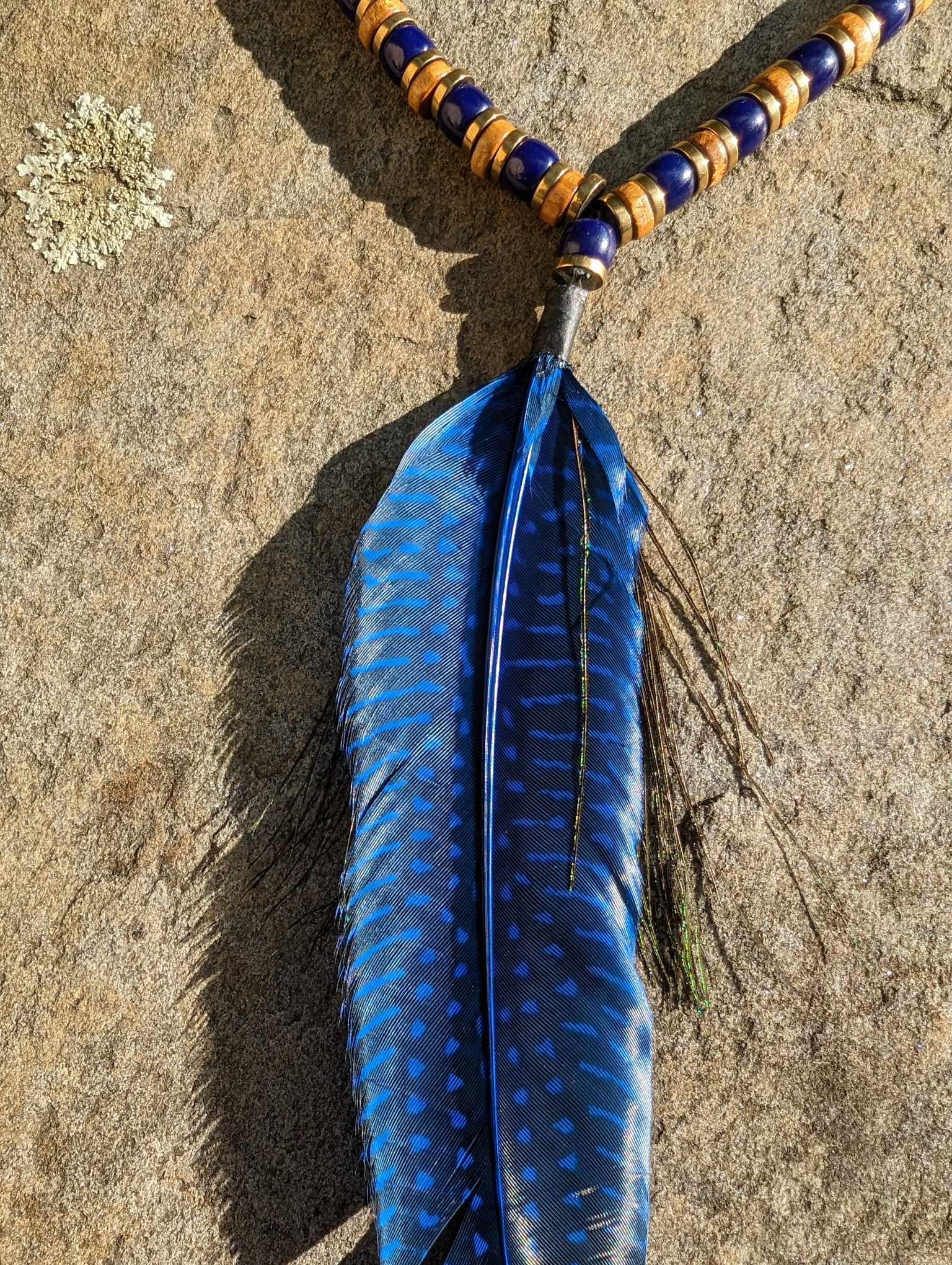 Wood Cobalt Blue Glass and Metal Beaded Peacock Feather Necklace