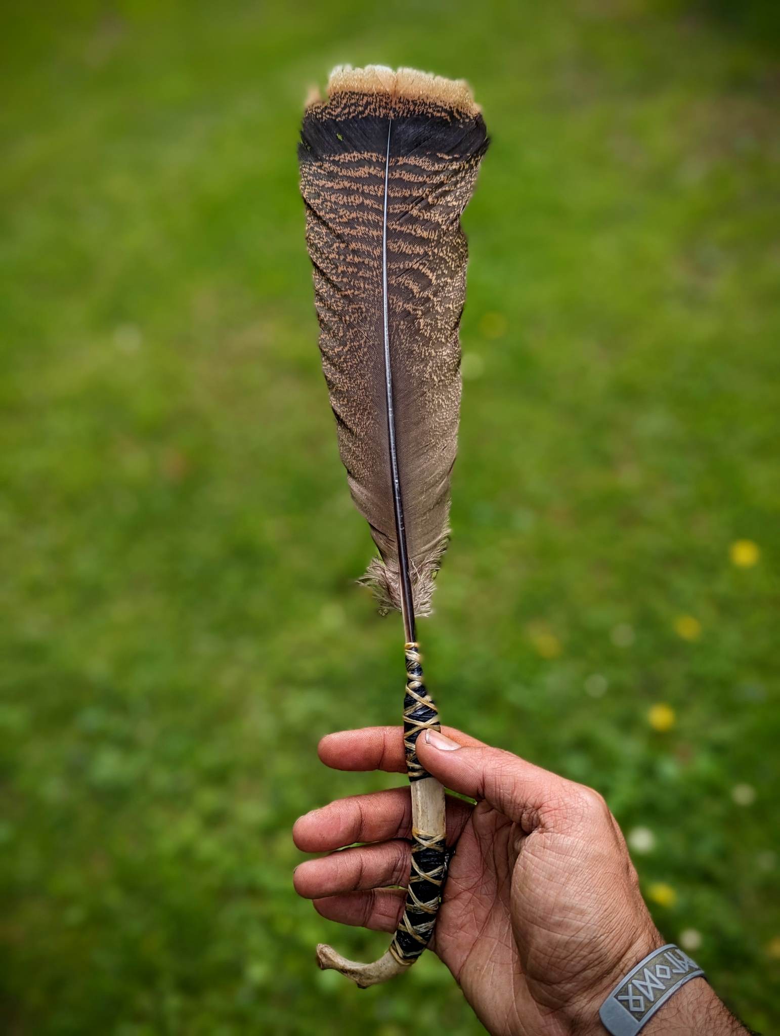 Extra large turkey feather and dear bone handle smoke fan. Both harvested naturally from the land here in the Blue Ridge Mountains of Appalachia. Rabbit fur has been added to the handle. Total length about 24 inches.